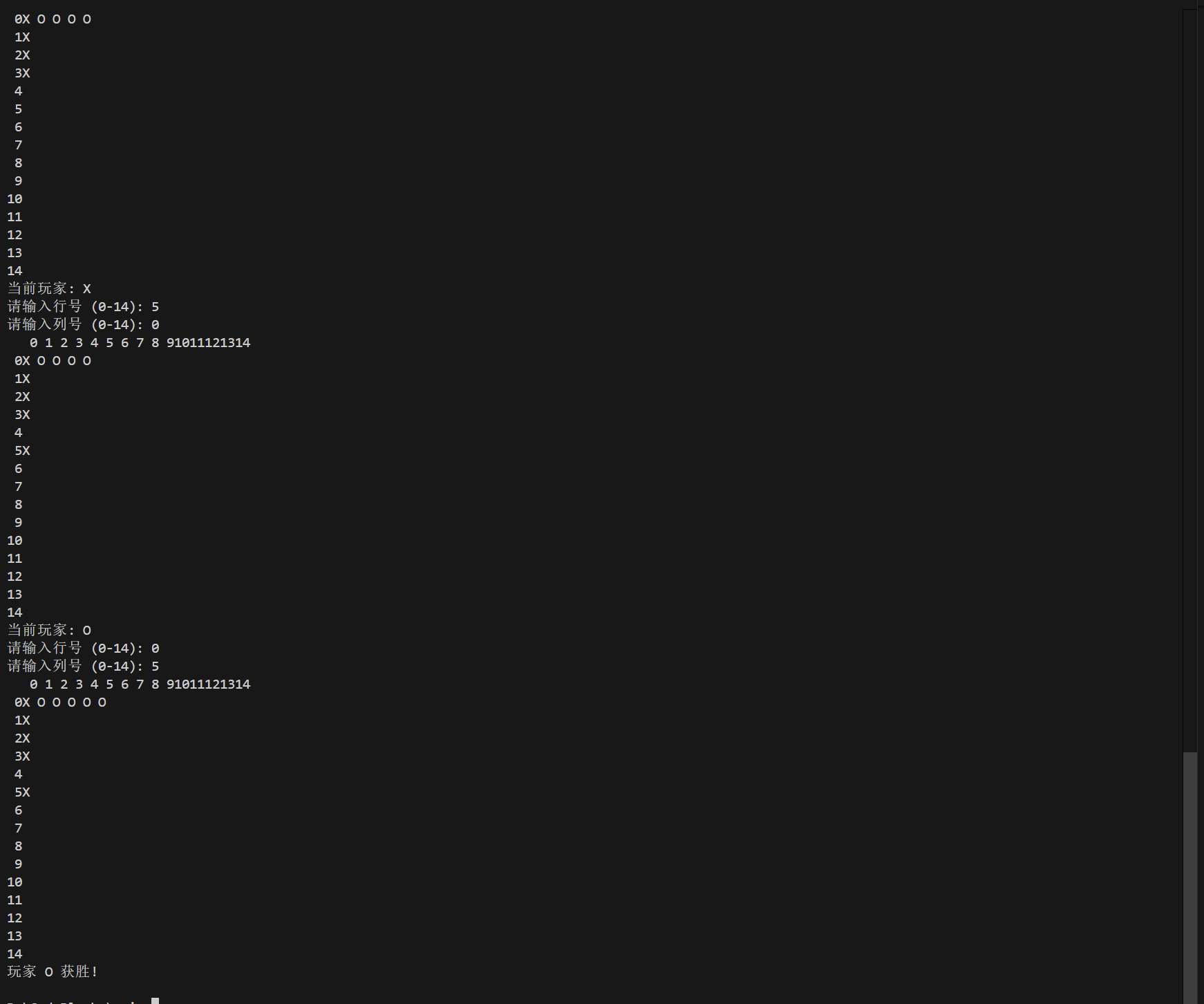 每落一子后,程序会检查是否形成五连子,若形成则当前玩家获胜,游戏结束。