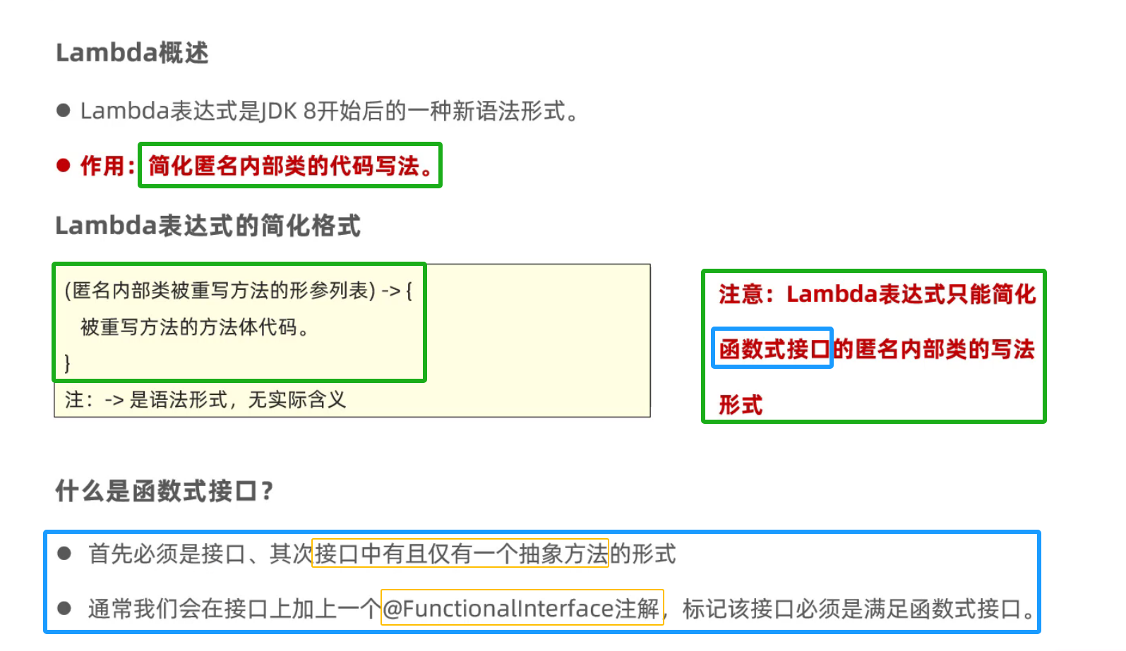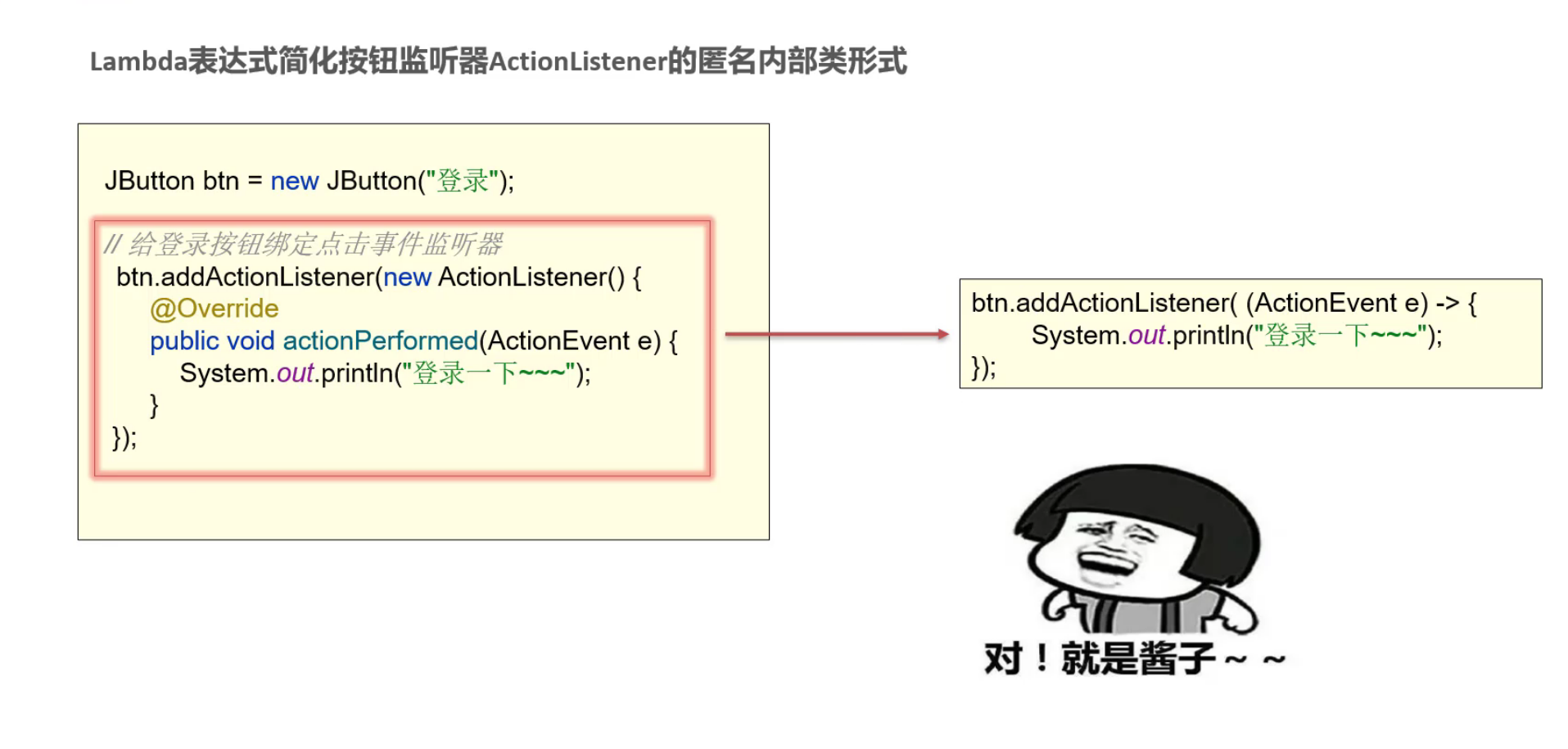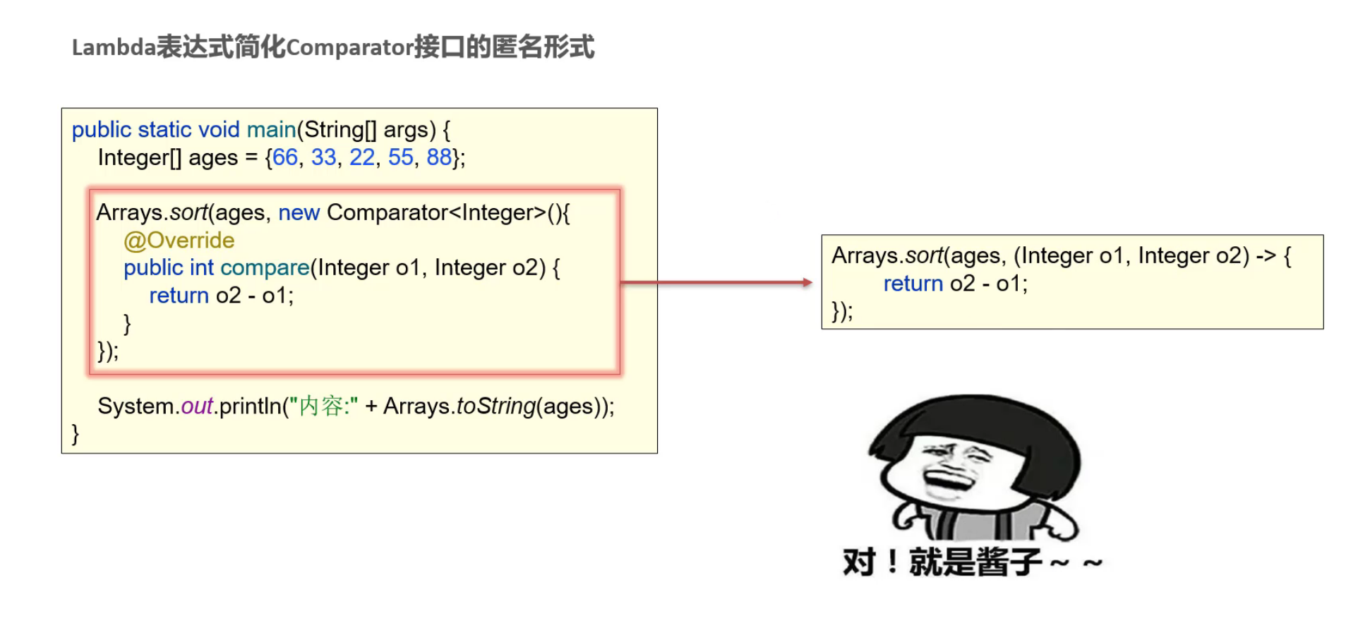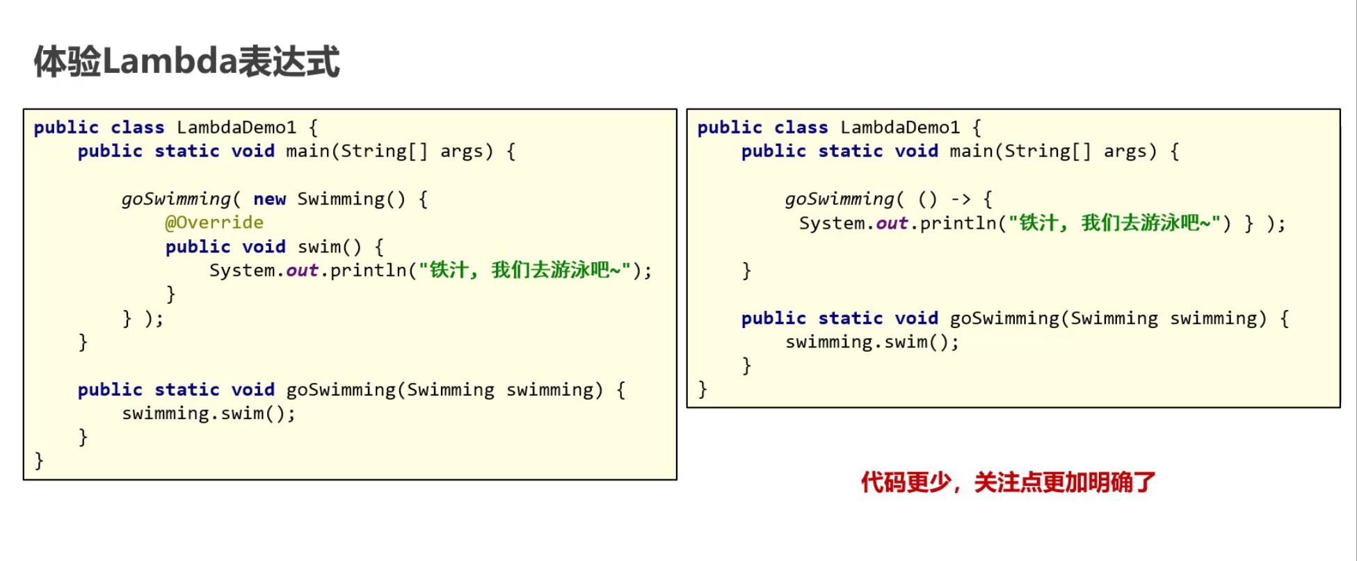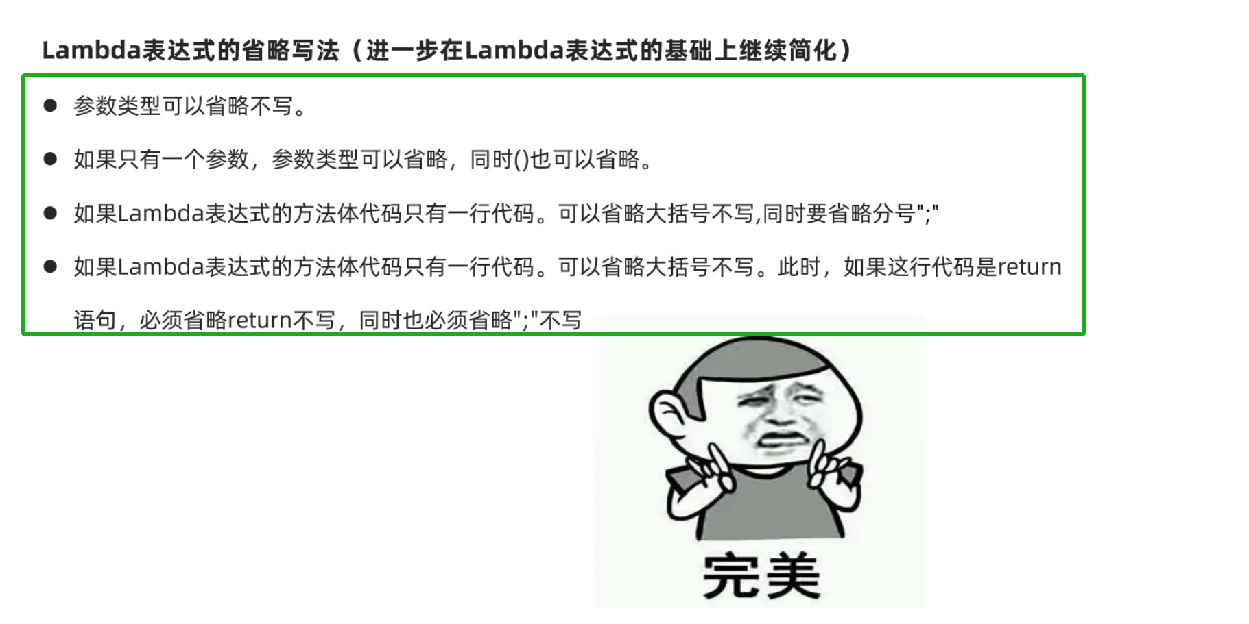 4.如果Lambda表达式的方法体代码只有一行代码,则可以省略大括号不写。(此时如果这行代码是return语句,则可省略return不写,同时也必须省略";"不写)