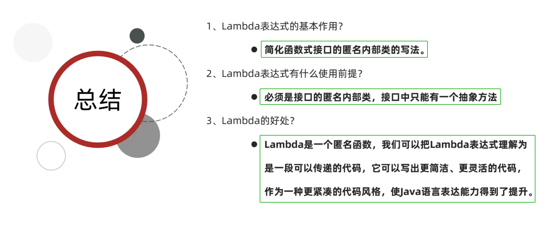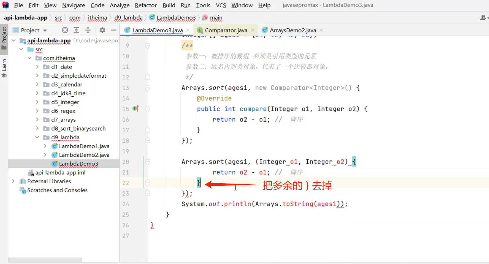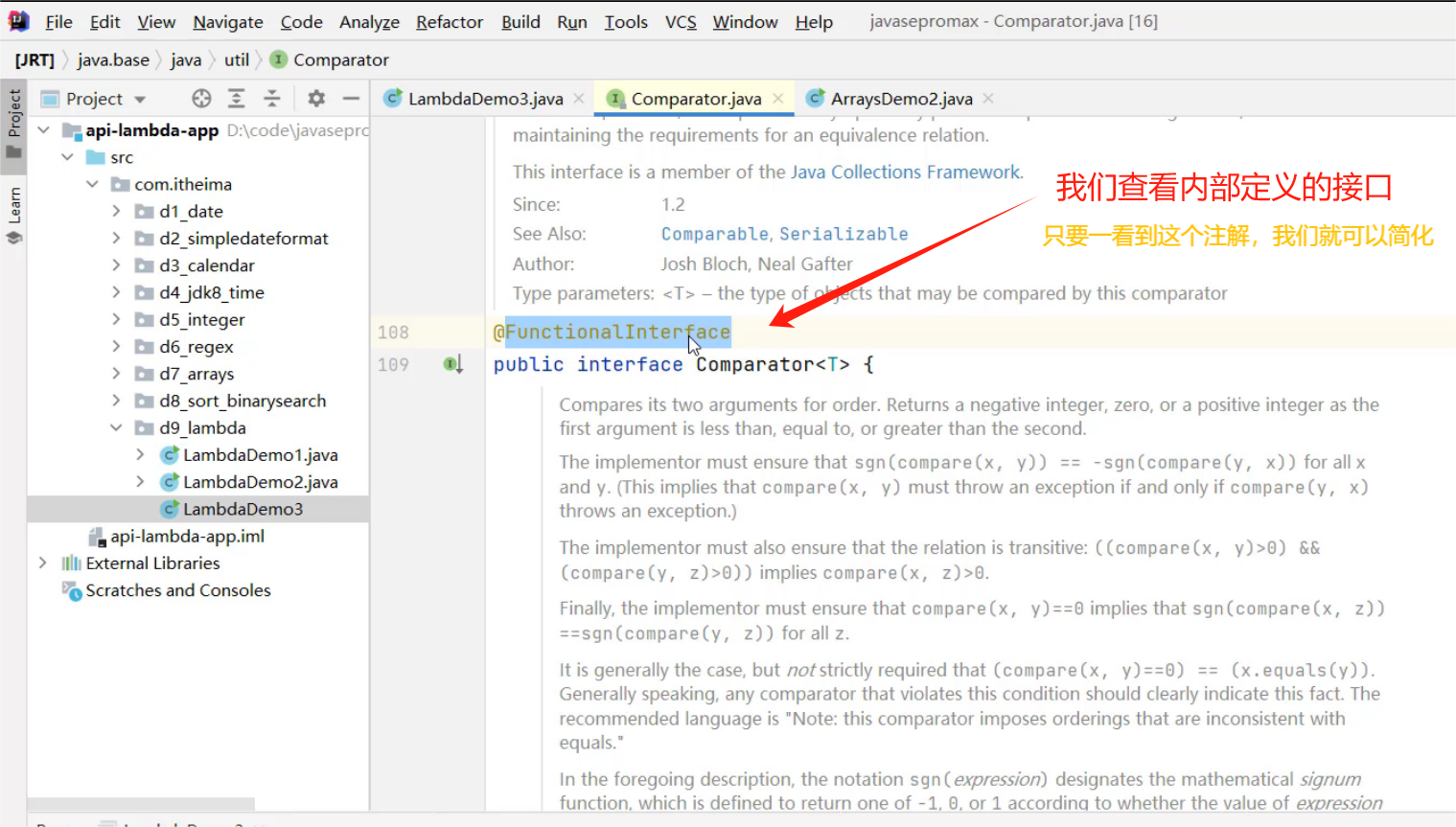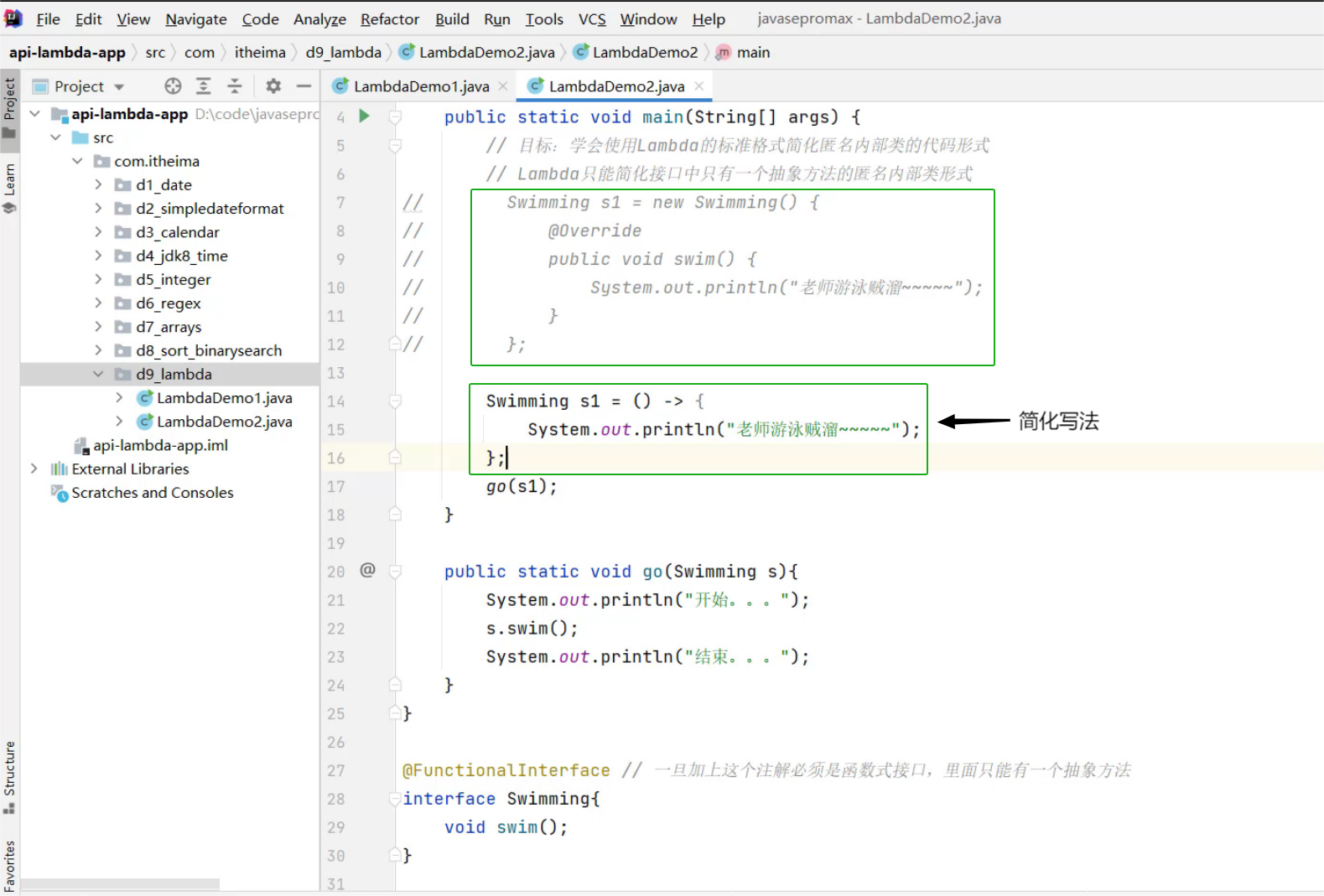 4.如果Lambda表达式的方法体代码只有一行代码,则可以省略大括号不写。(此时如果这行代码是return语句,则可省略return不写,同时也必须省略";"不写)