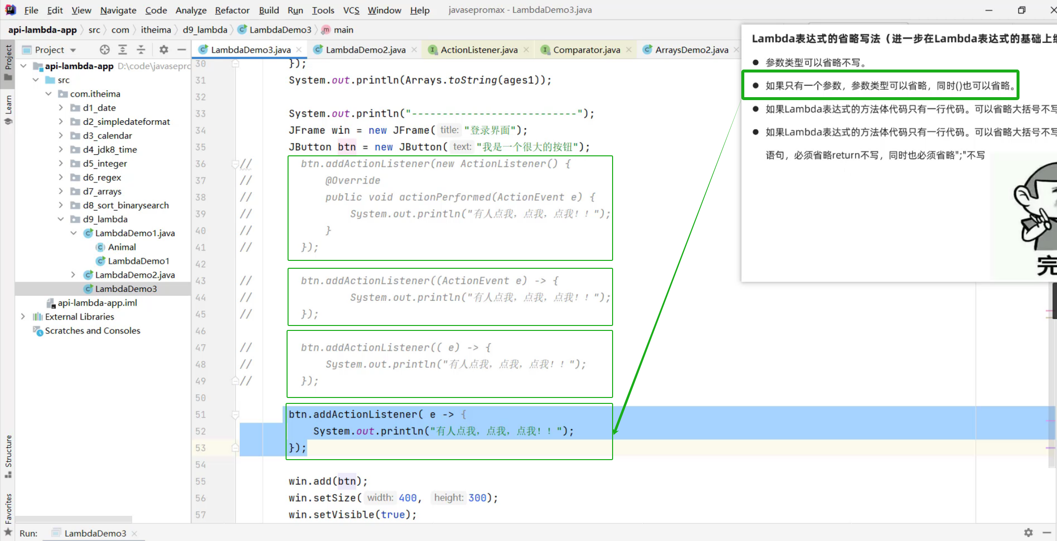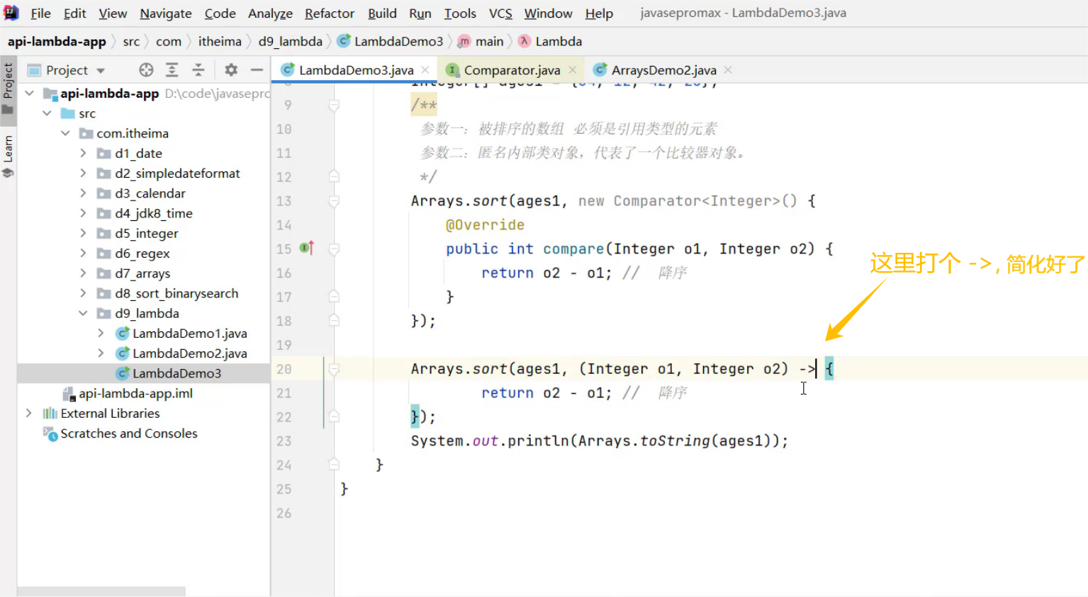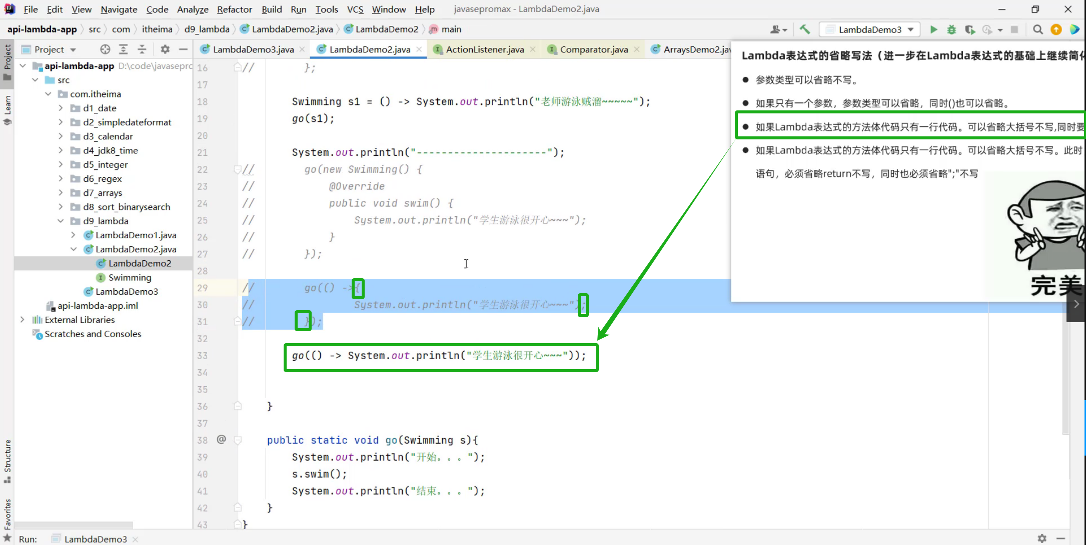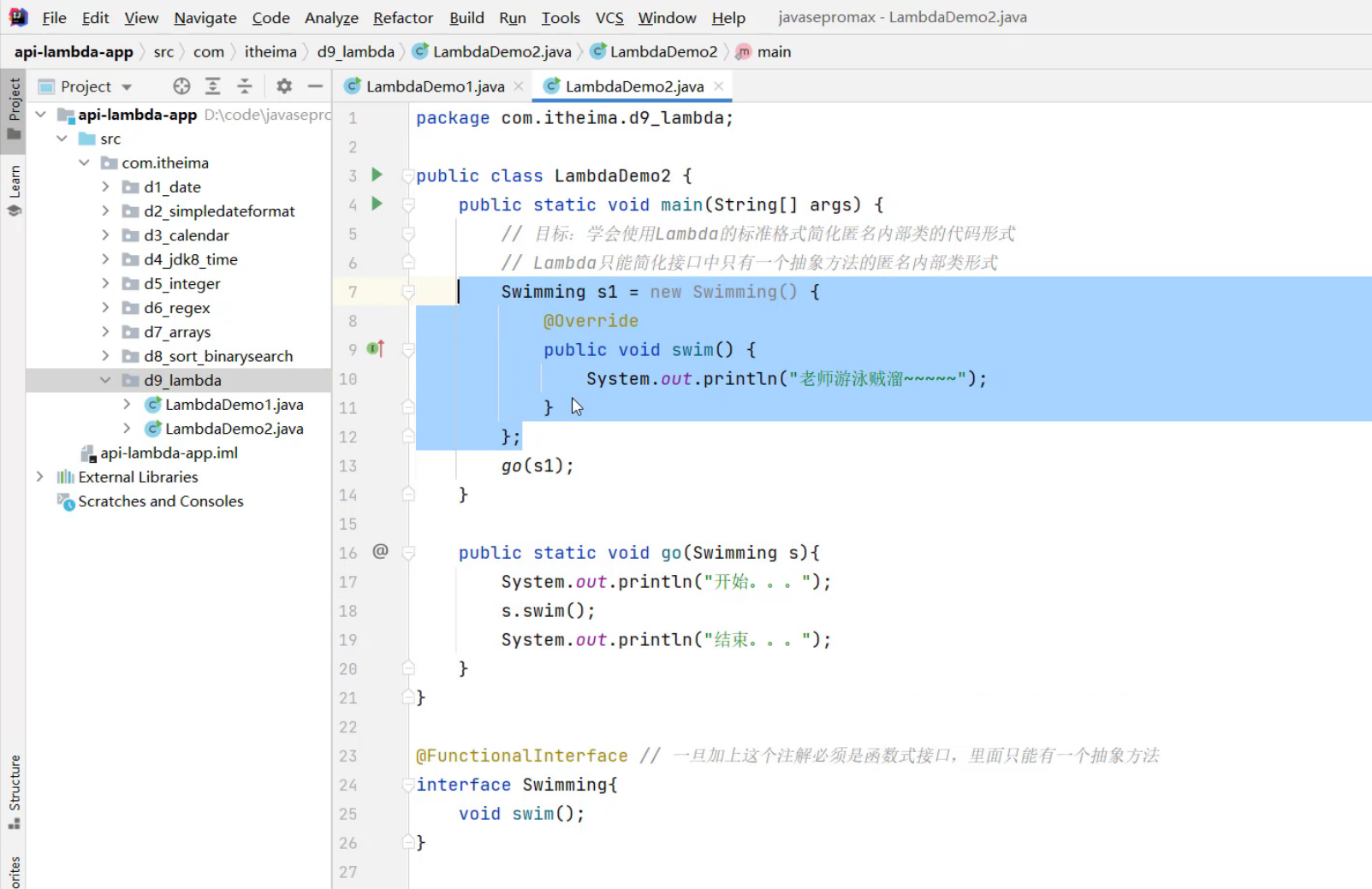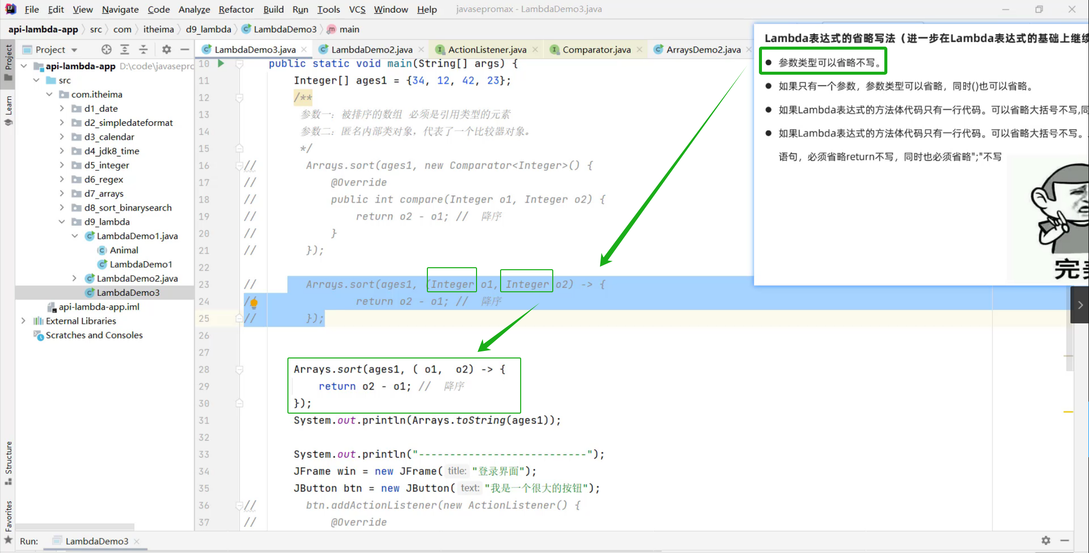 4.如果Lambda表达式的方法体代码只有一行代码,则可以省略大括号不写。(此时如果这行代码是return语句,则可省略return不写,同时也必须省略";"不写)
