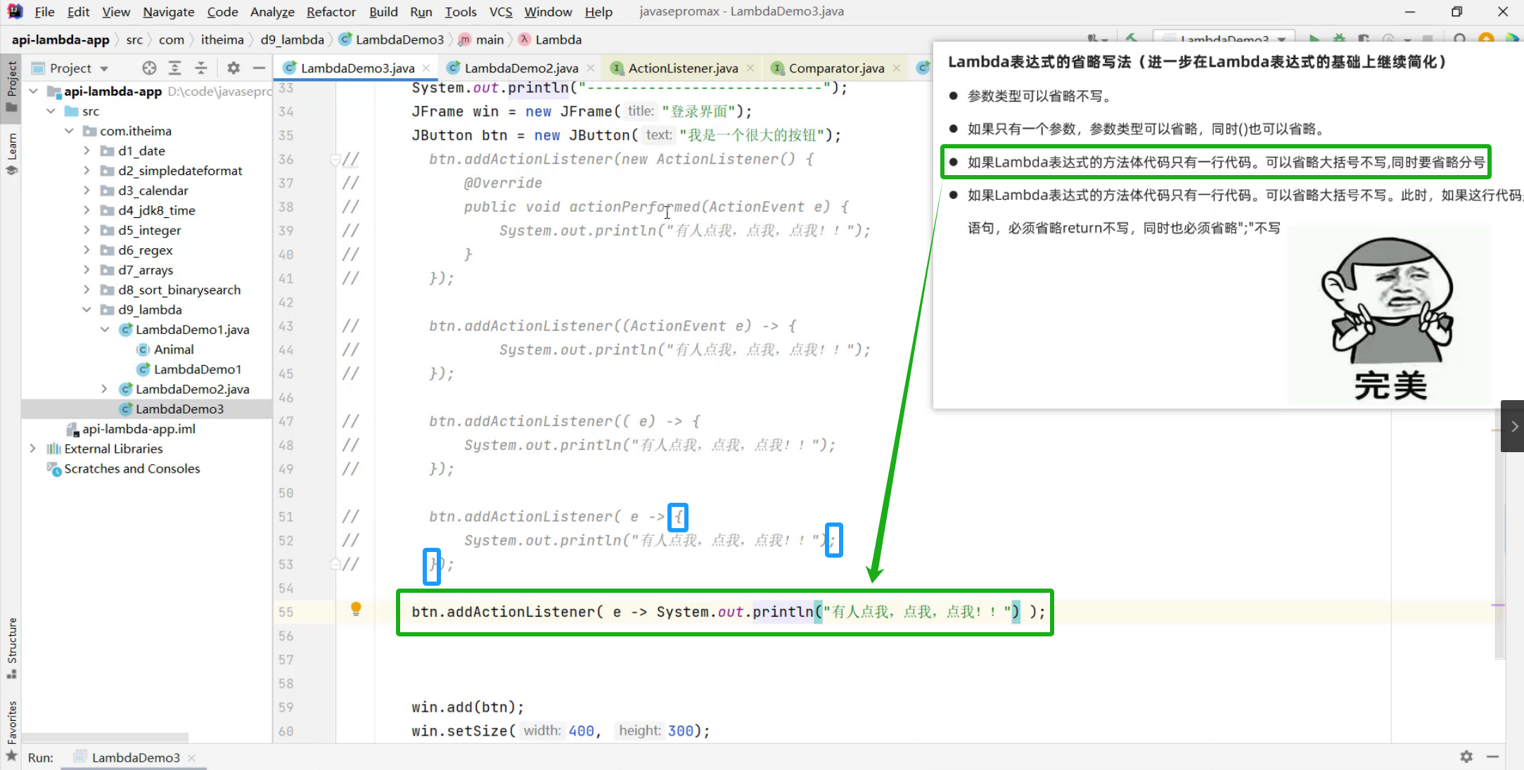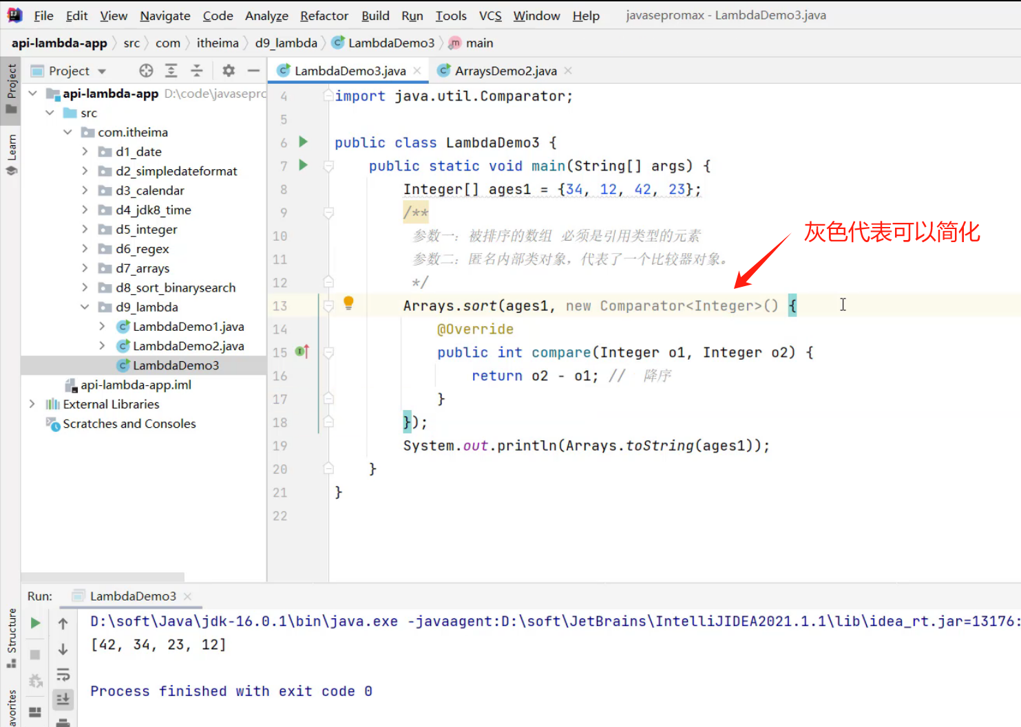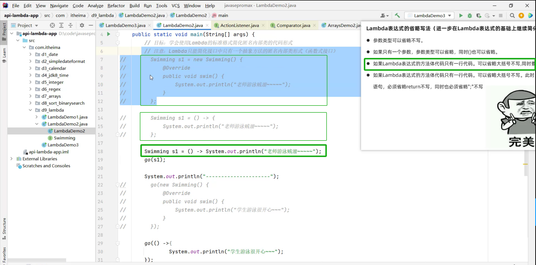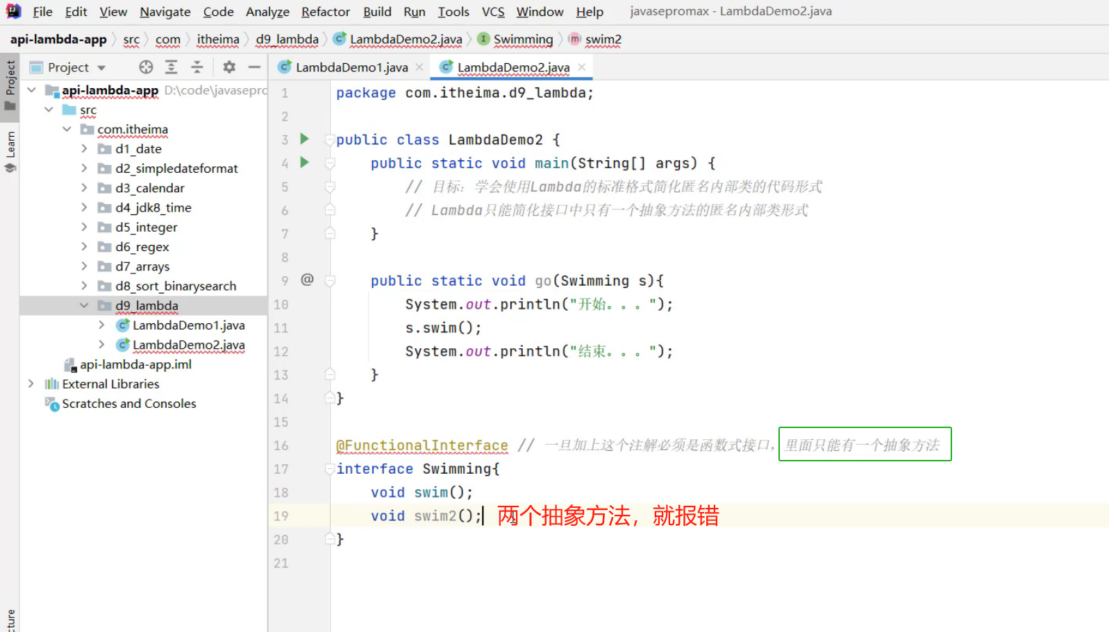 4.如果Lambda表达式的方法体代码只有一行代码,则可以省略大括号不写。(此时如果这行代码是return语句,则可省略return不写,同时也必须省略";"不写)