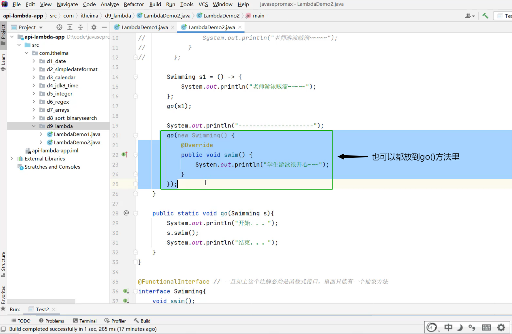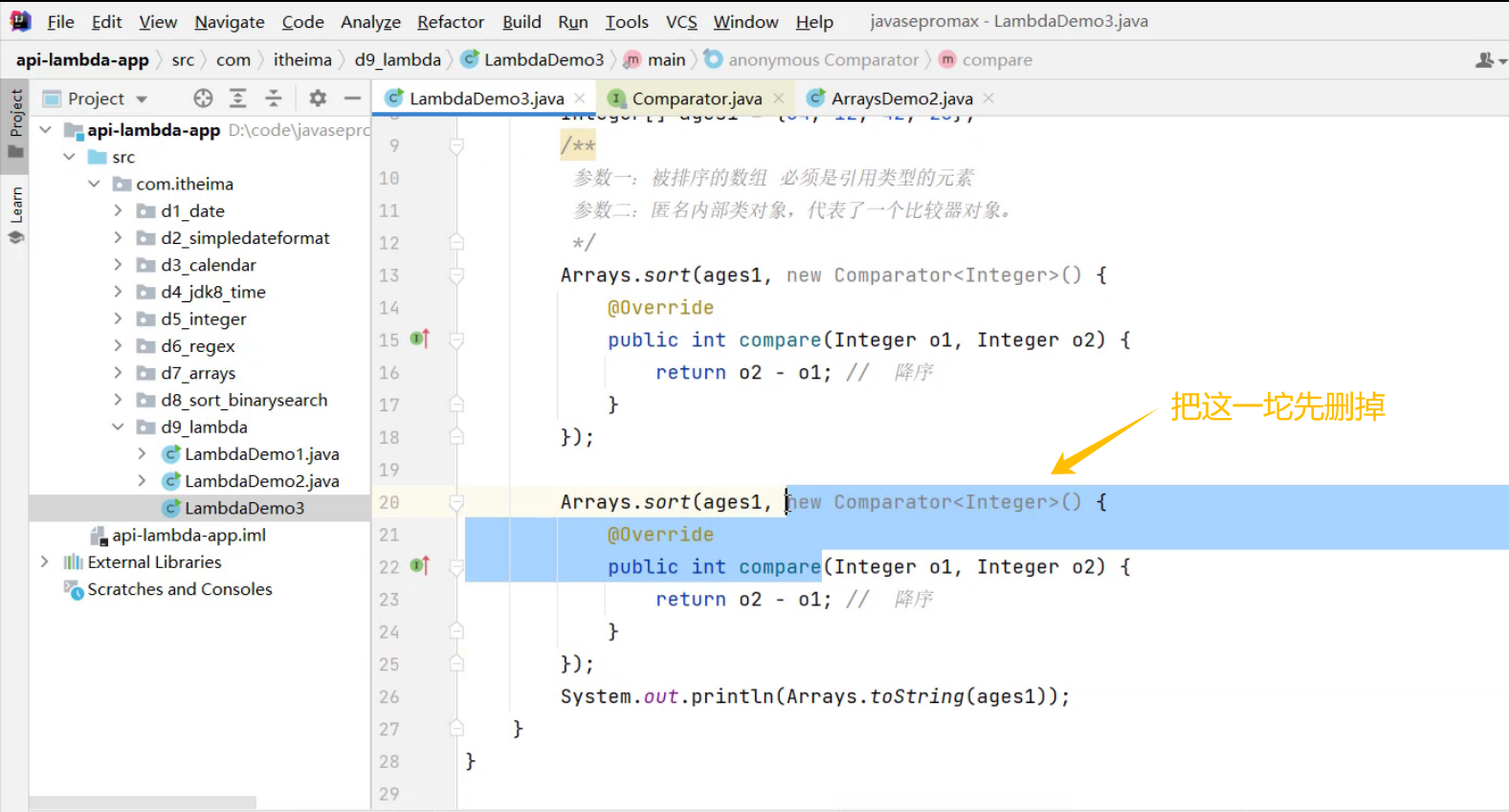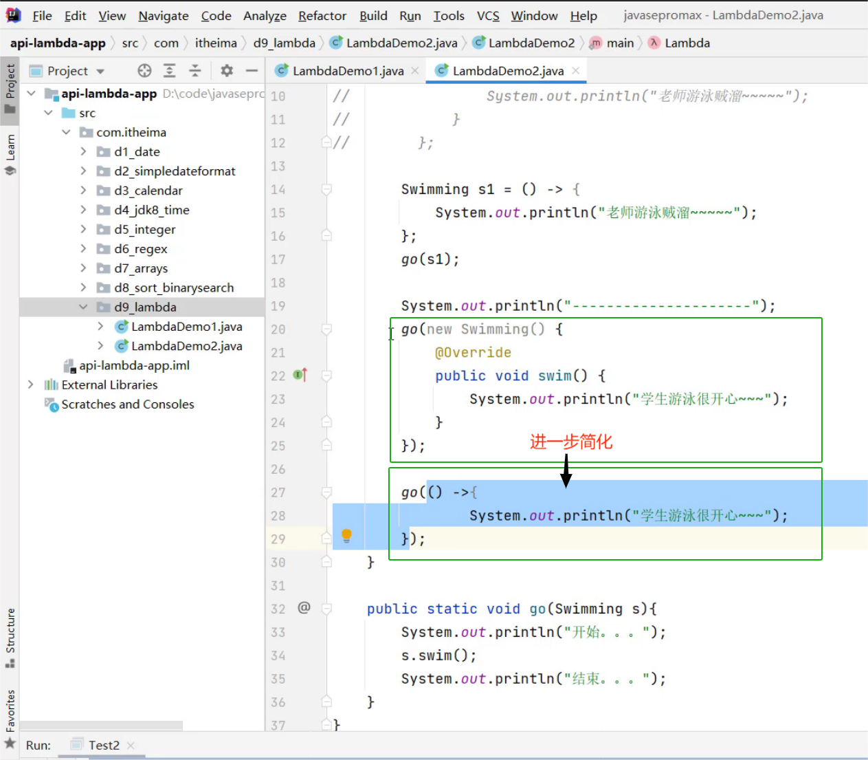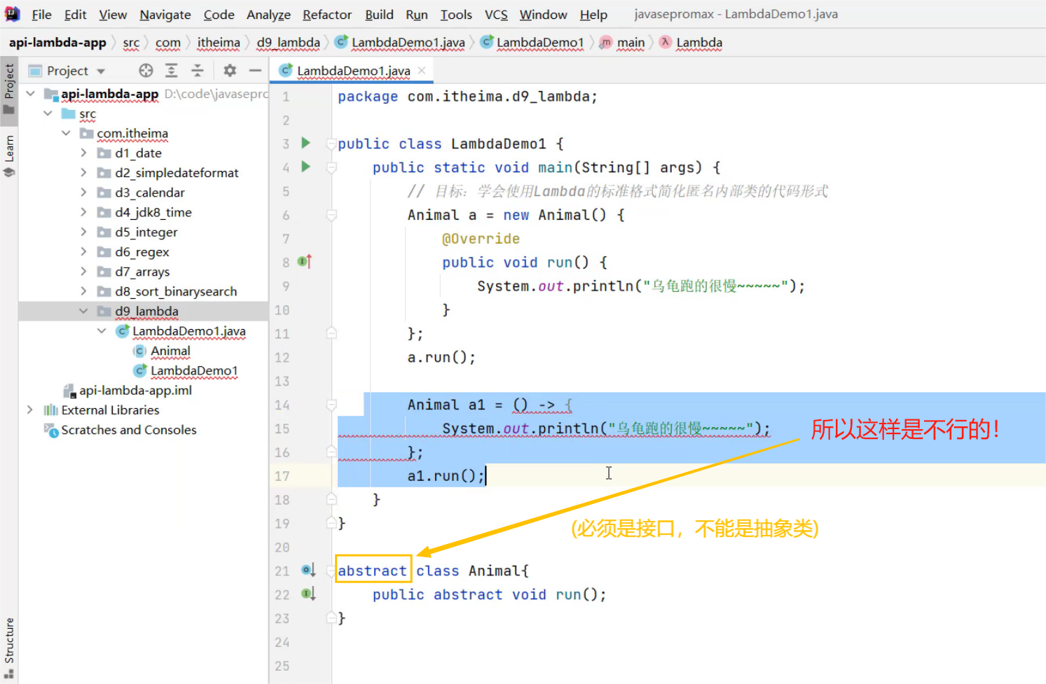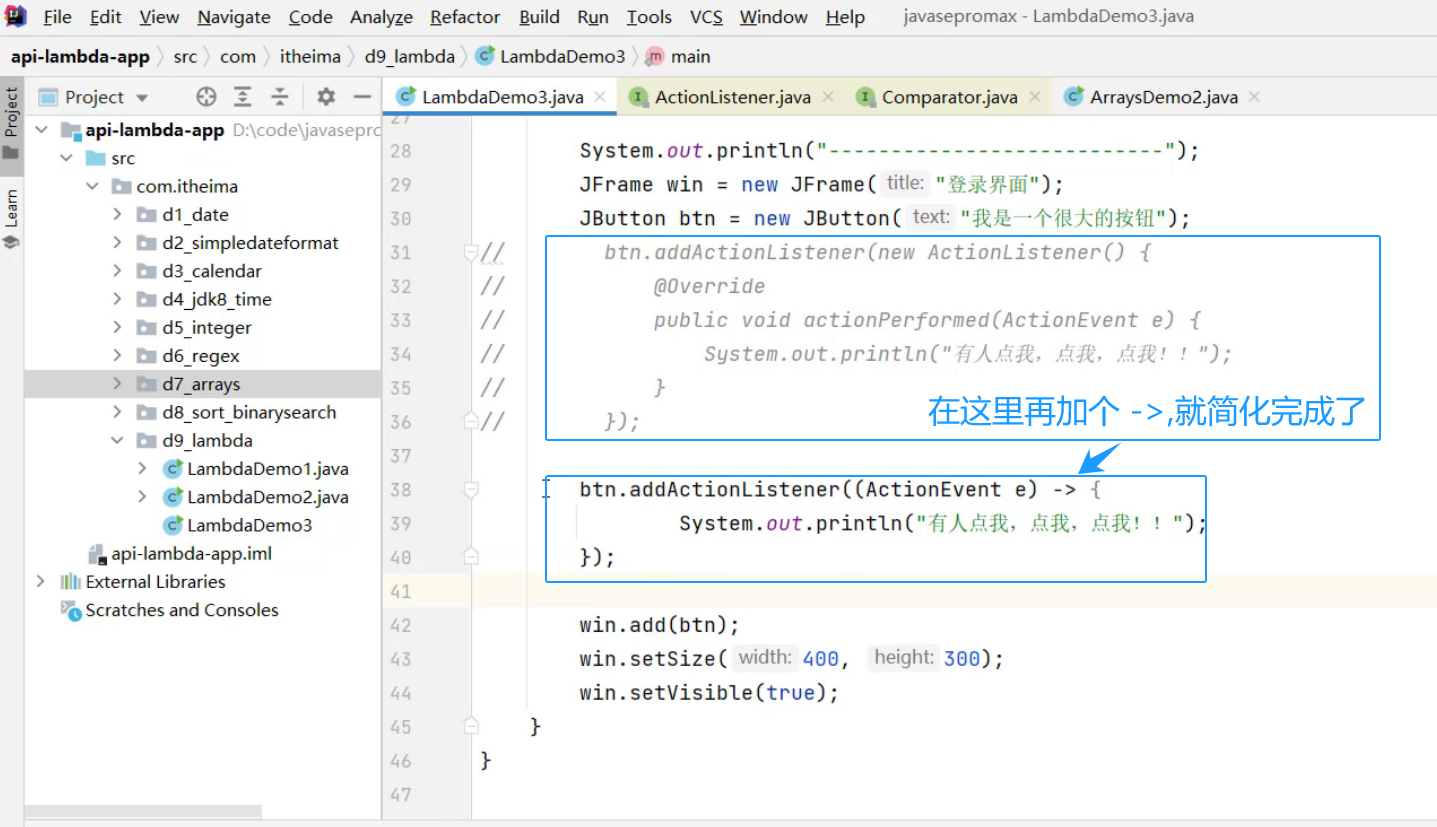 4.如果Lambda表达式的方法体代码只有一行代码,则可以省略大括号不写。(此时如果这行代码是return语句,则可省略return不写,同时也必须省略";"不写)
