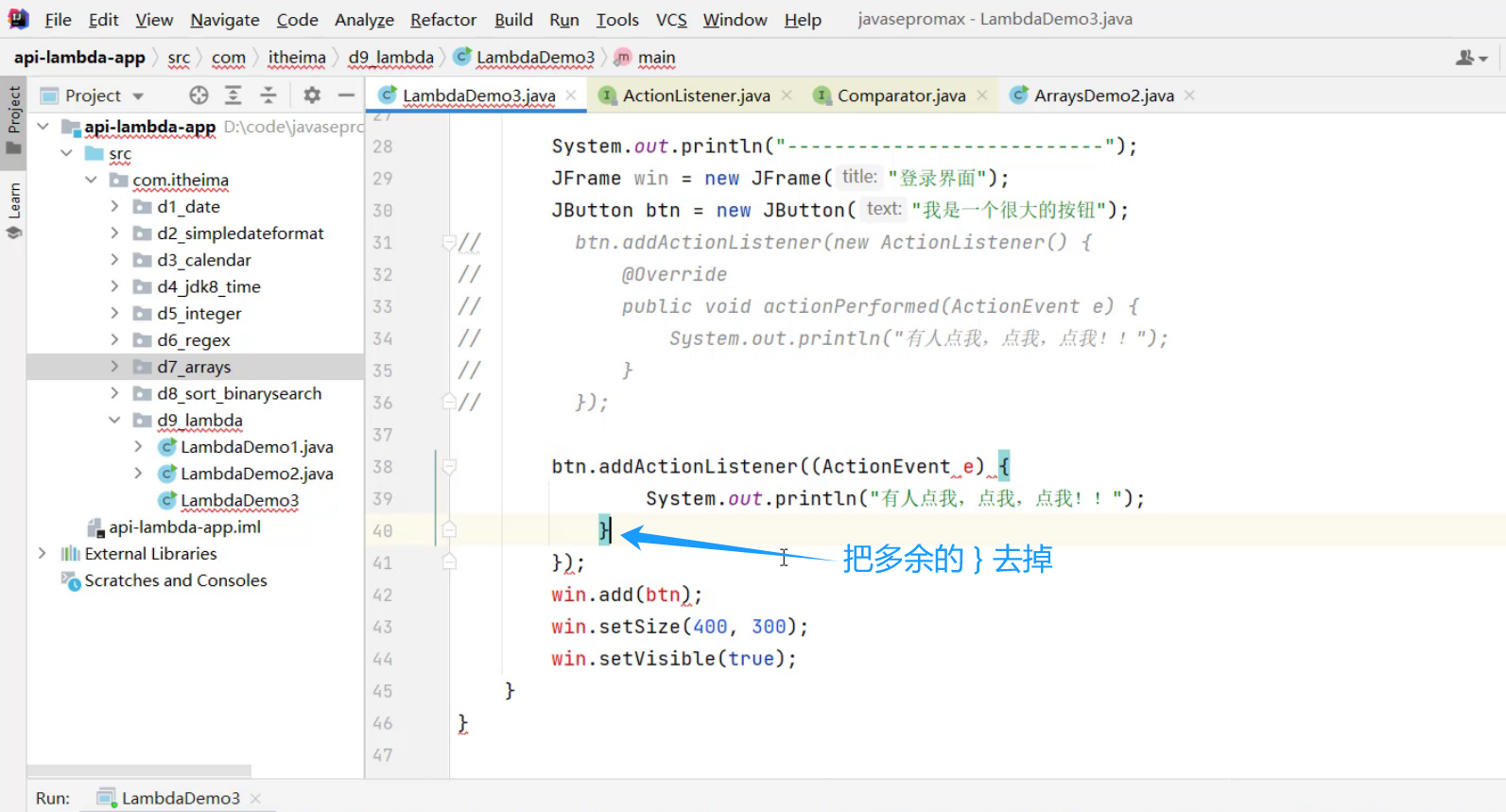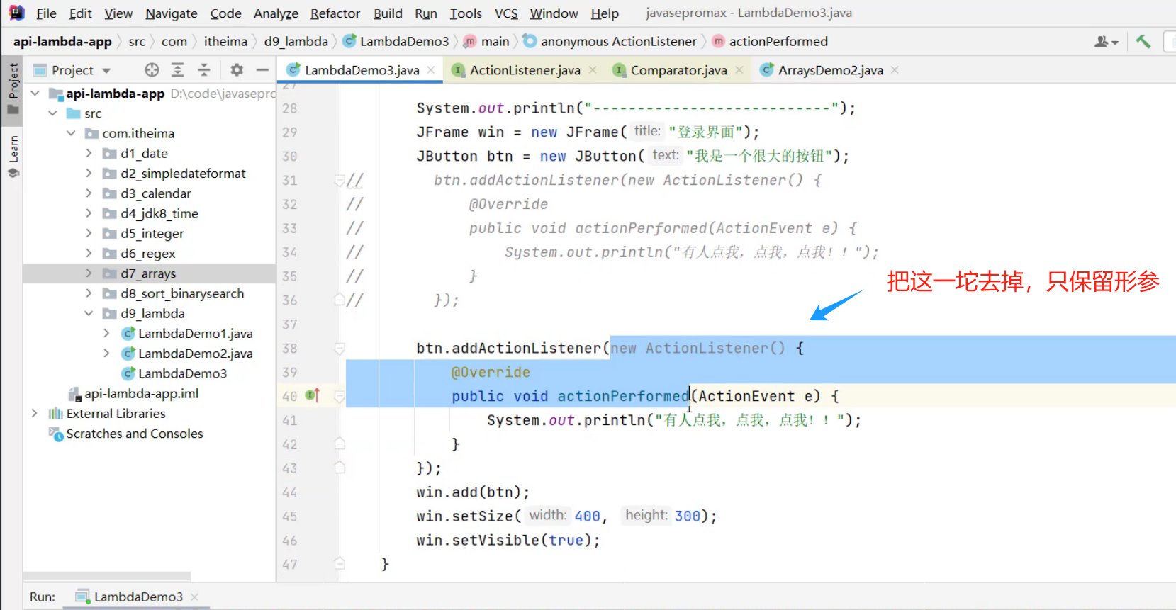 3.如果Lambda表达式的方法体代码只有一行代码,则可以省略大括号不写,同时要省略分号";"