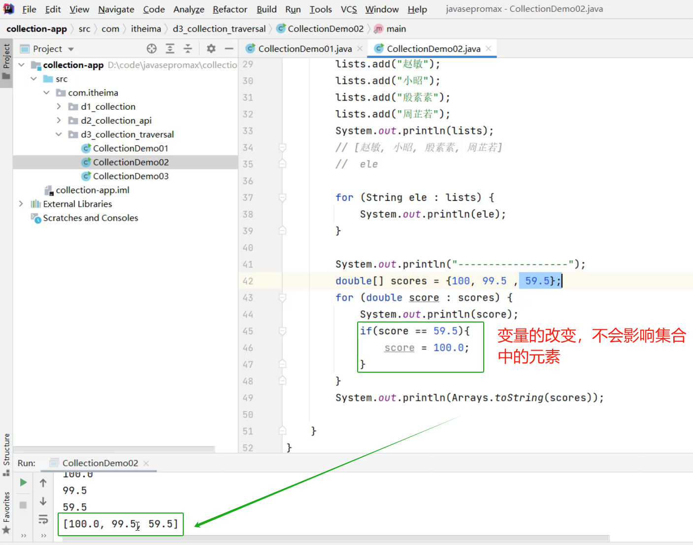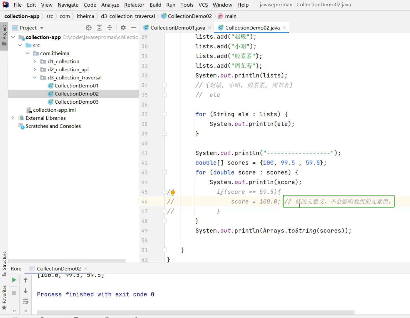 ③、遍历集合中的3个对象,输出相关信息