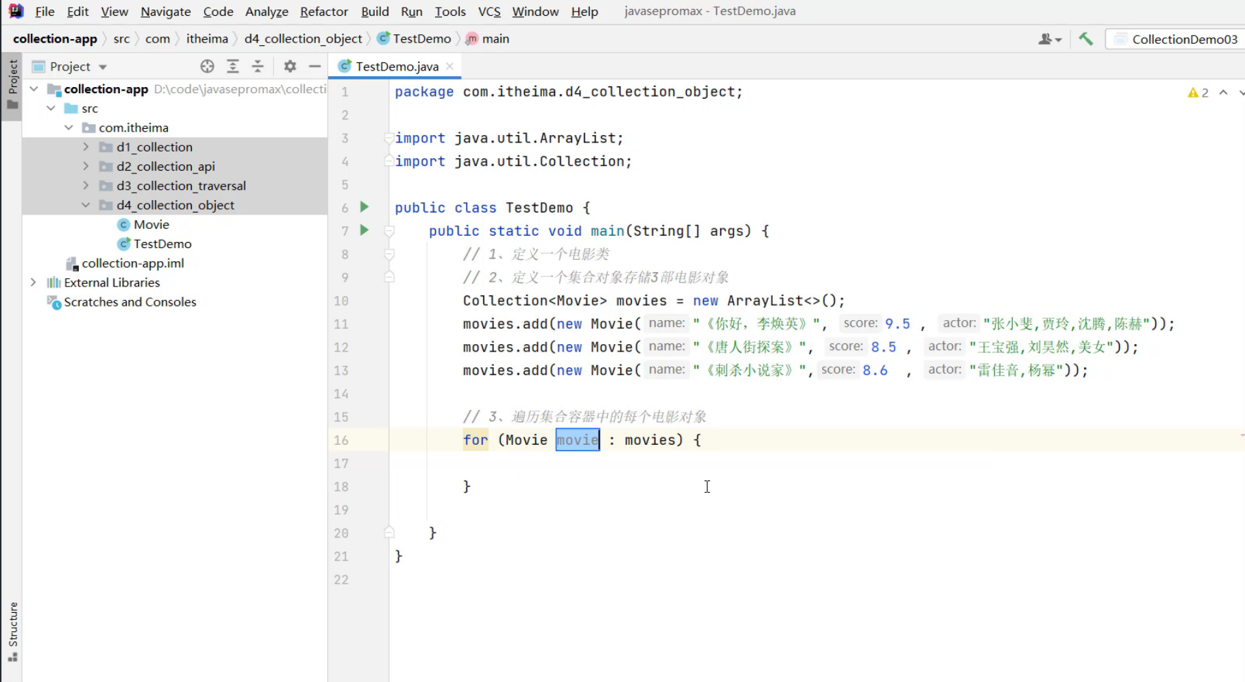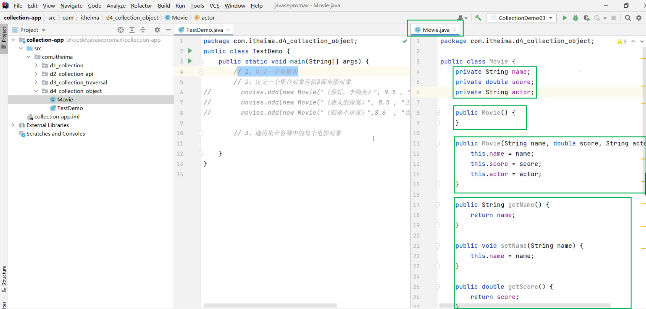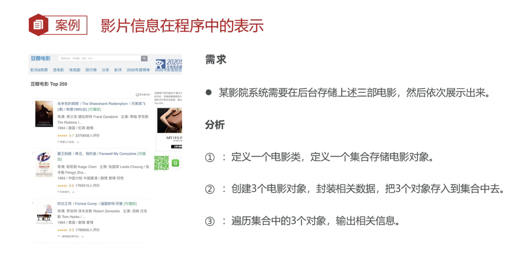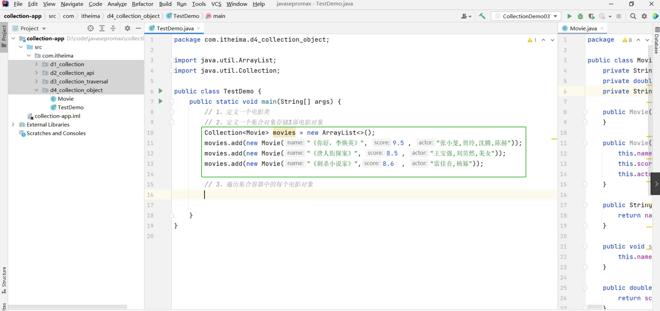 ②、创建3个电影对象,封装相关数据,把3个对象存入到集合中去