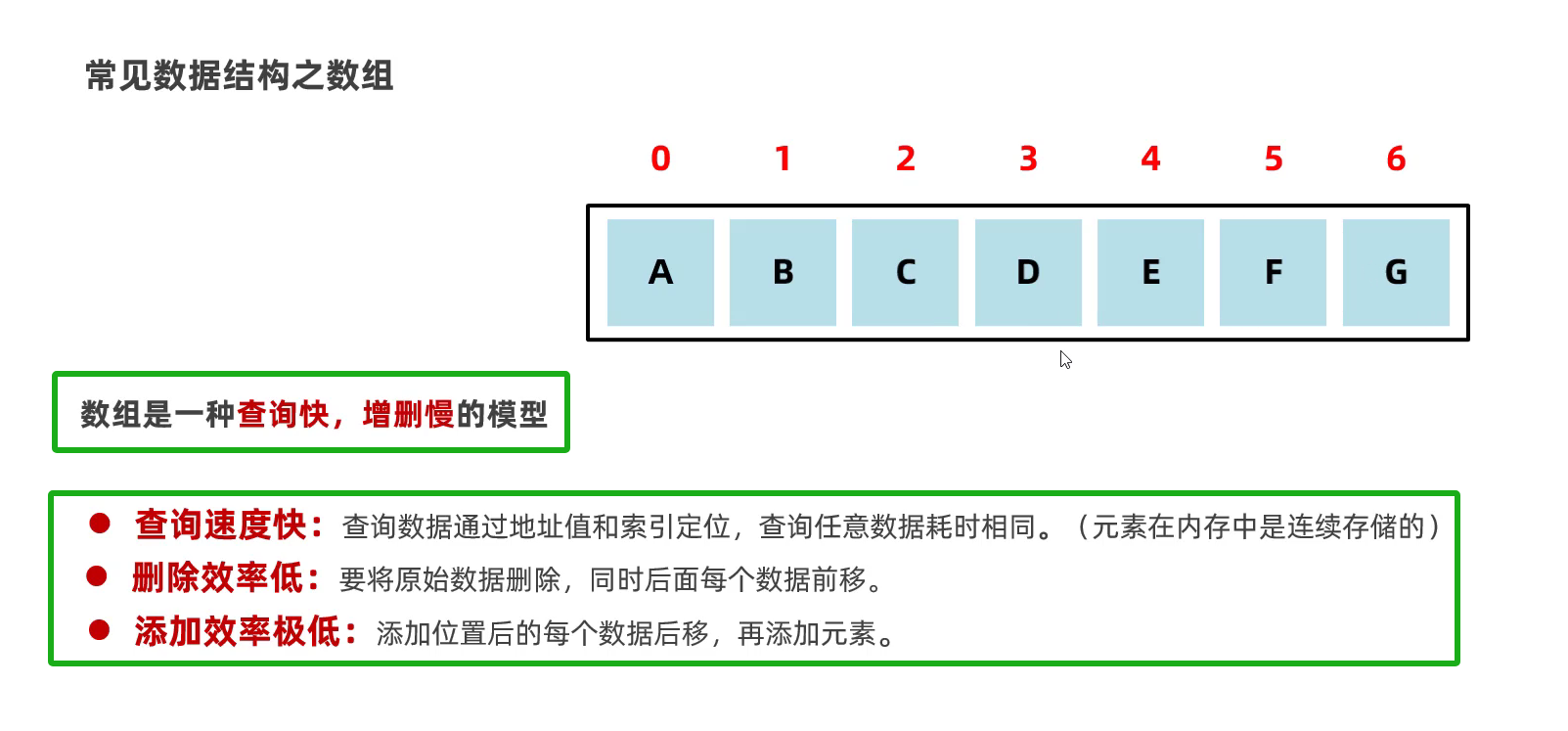 数组:适合查询元素,不适合增删元素 (元素在内存中是连续存储的,查询任意数据耗时相同)