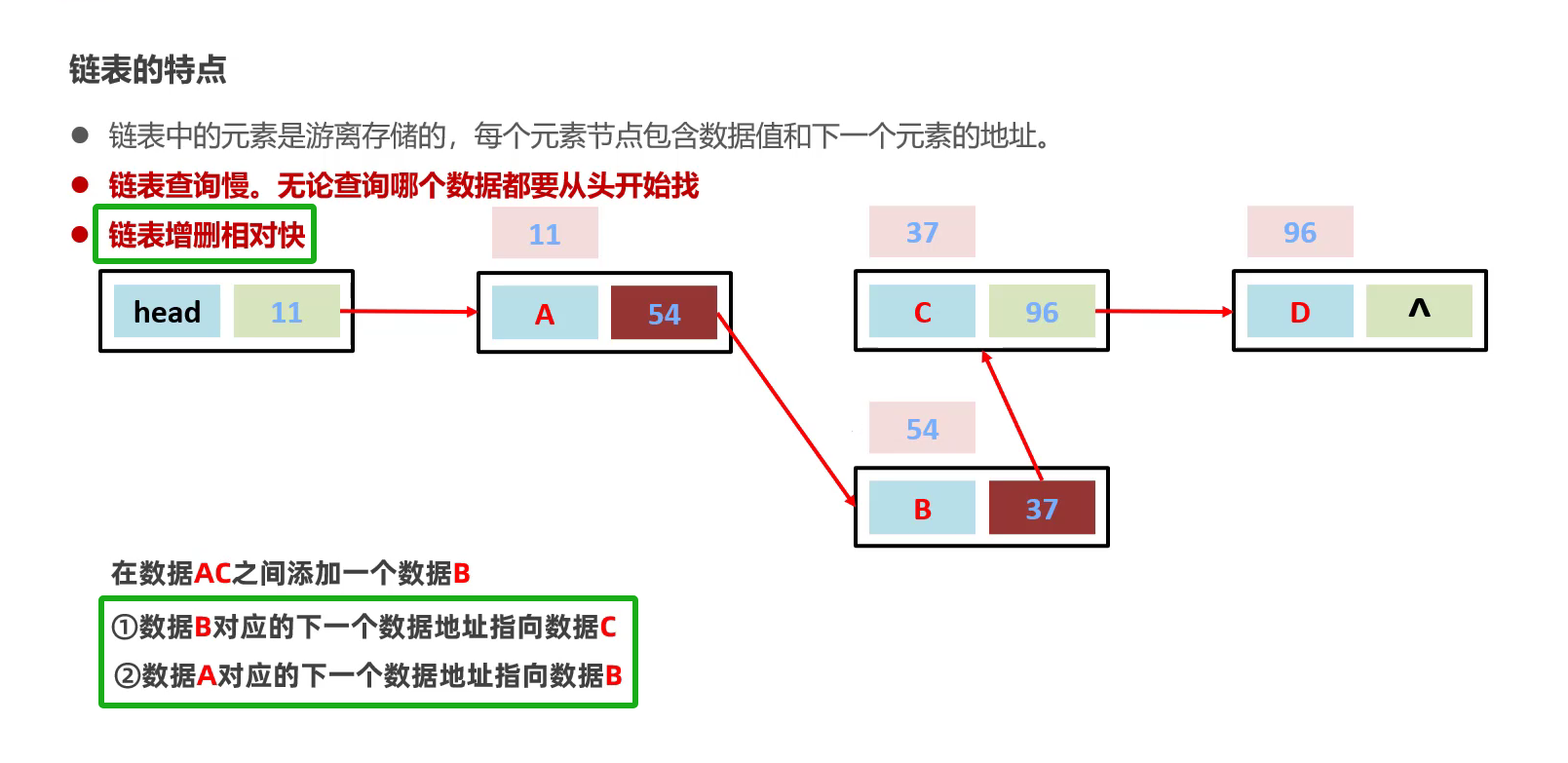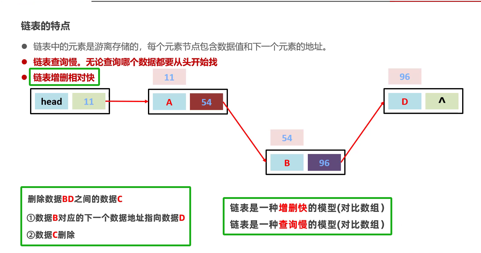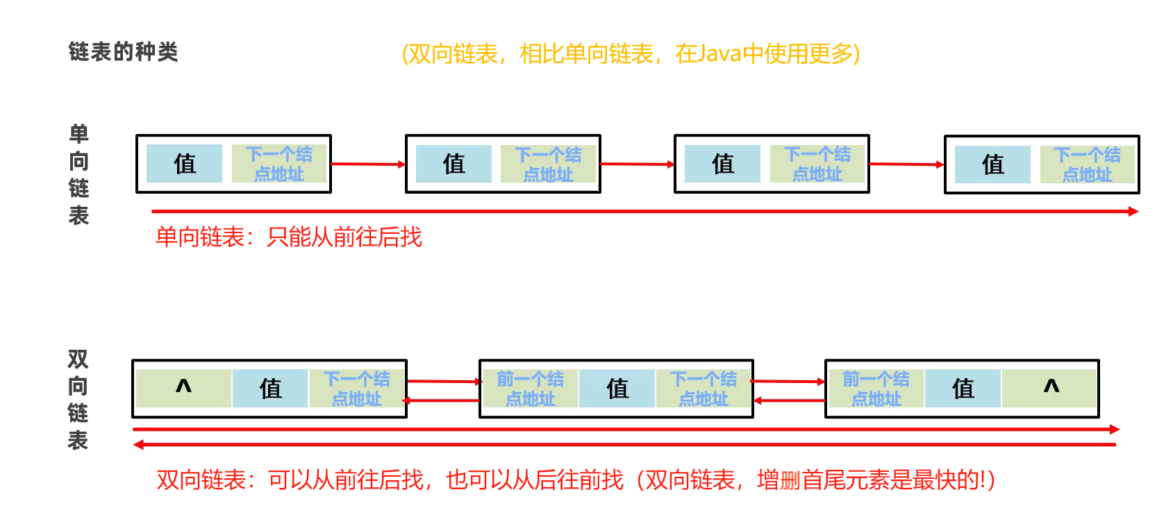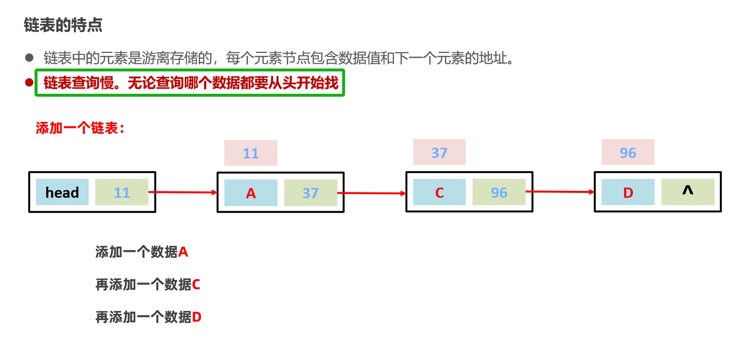 链表:每个元素结点包含当前结点数据值和下一结点的地址 (元素在内存中是不连续存储的)