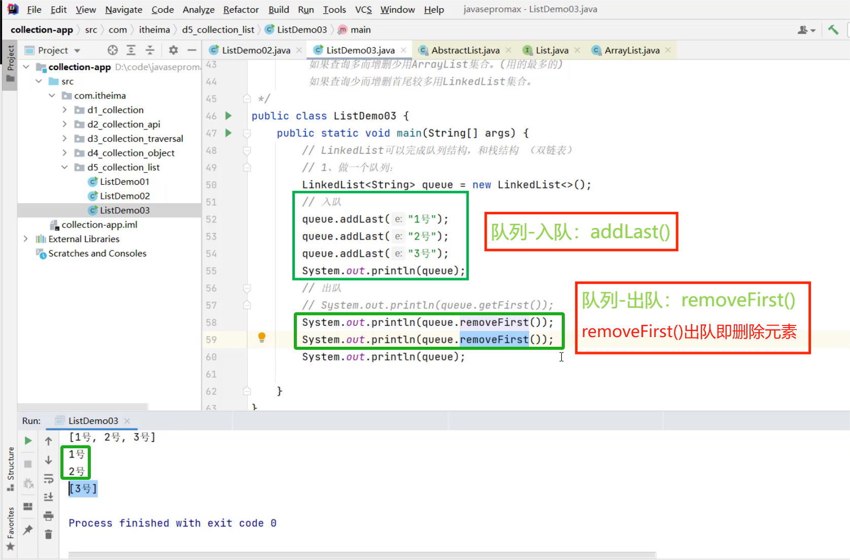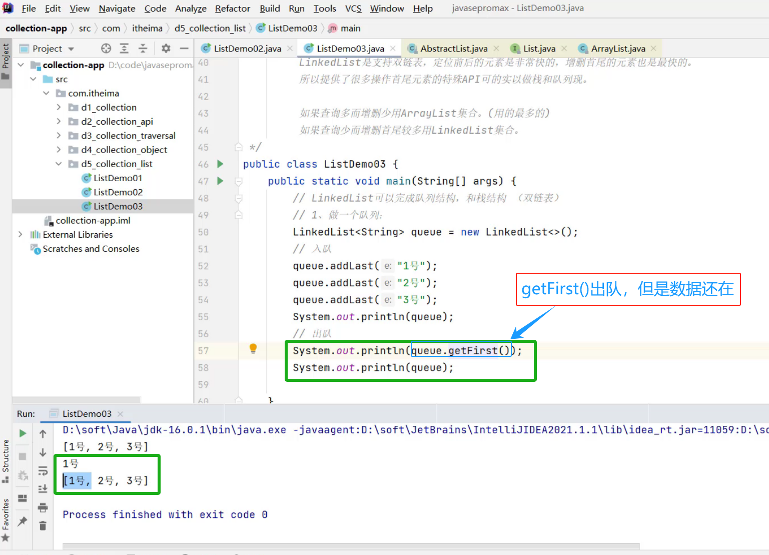 LinkList完成一个队列:入队 + 出队 (先入队先出队,后入队后出队)