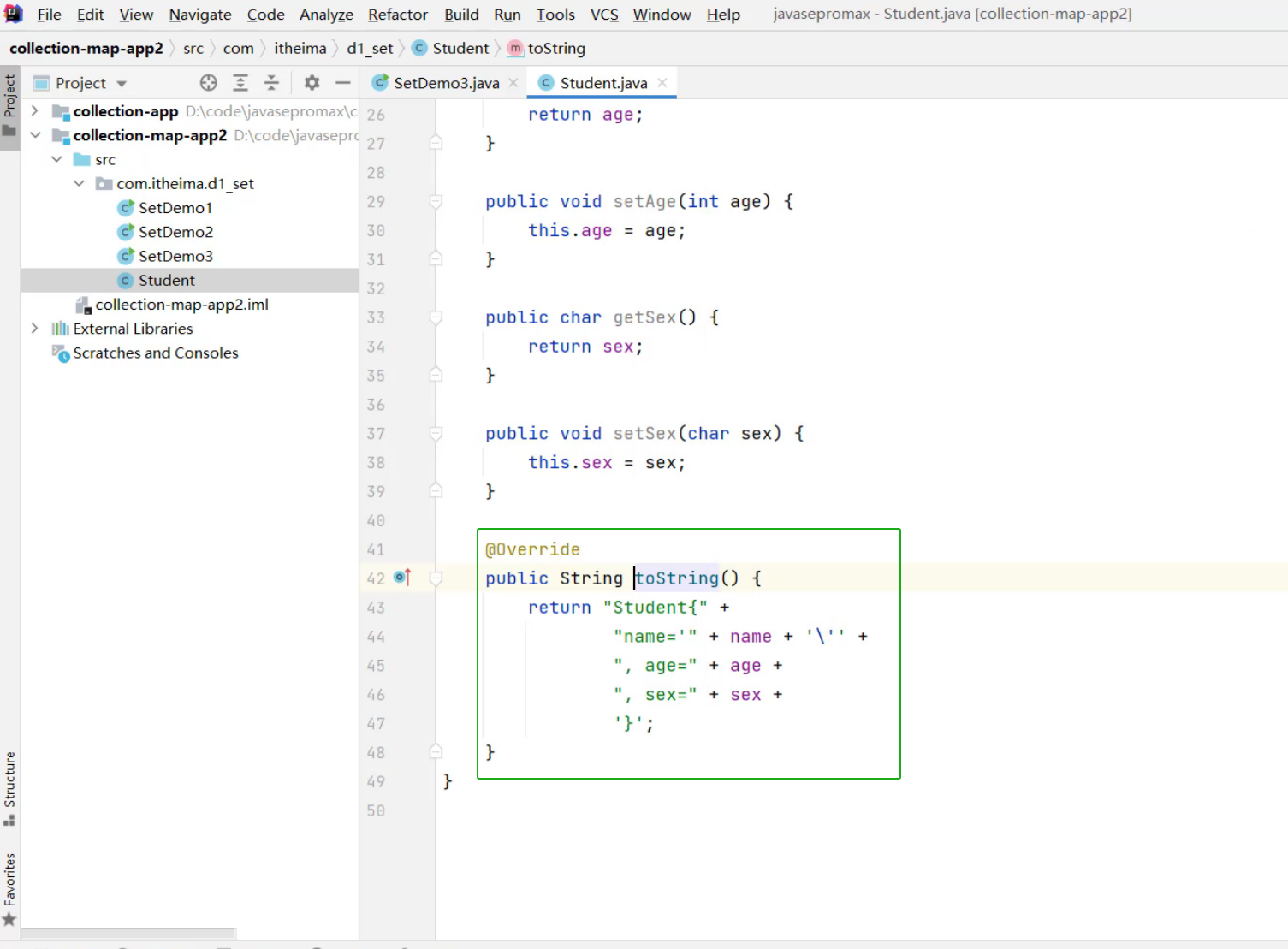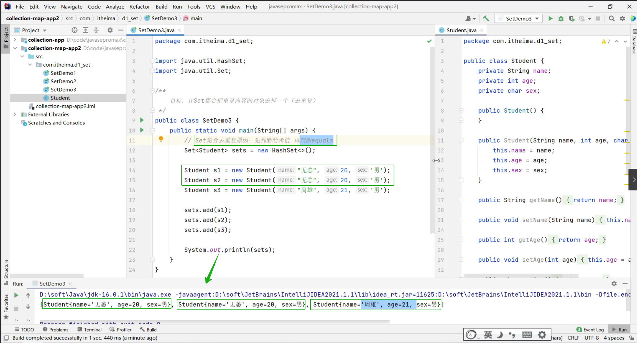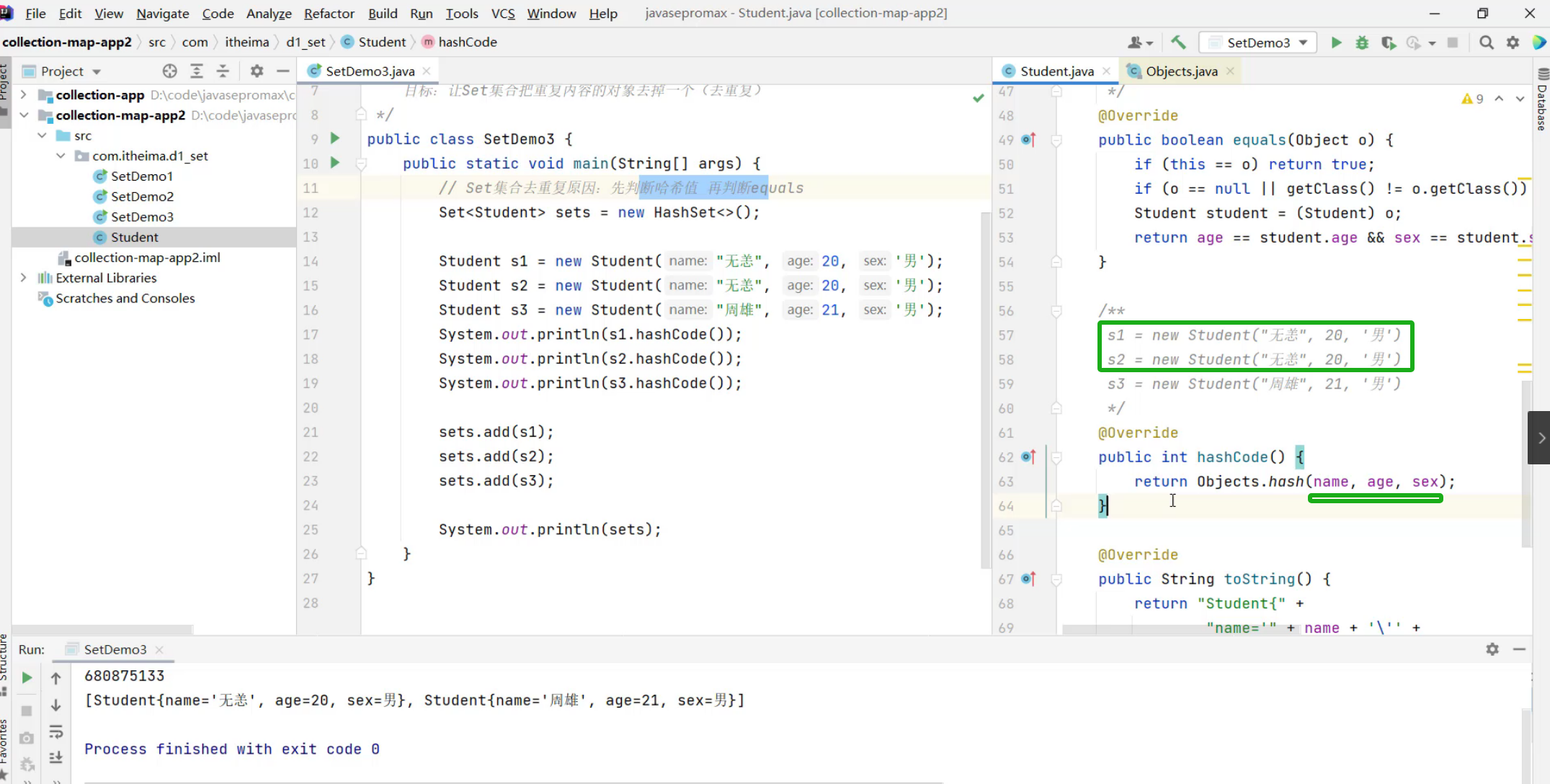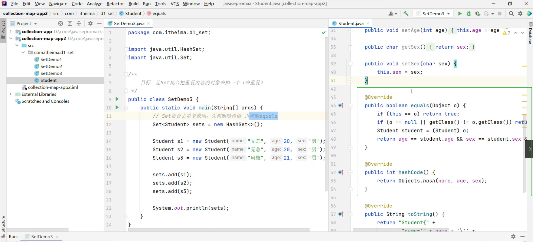 重写equals()和HashCode()方法之后,集合中重复元素被去除了:
