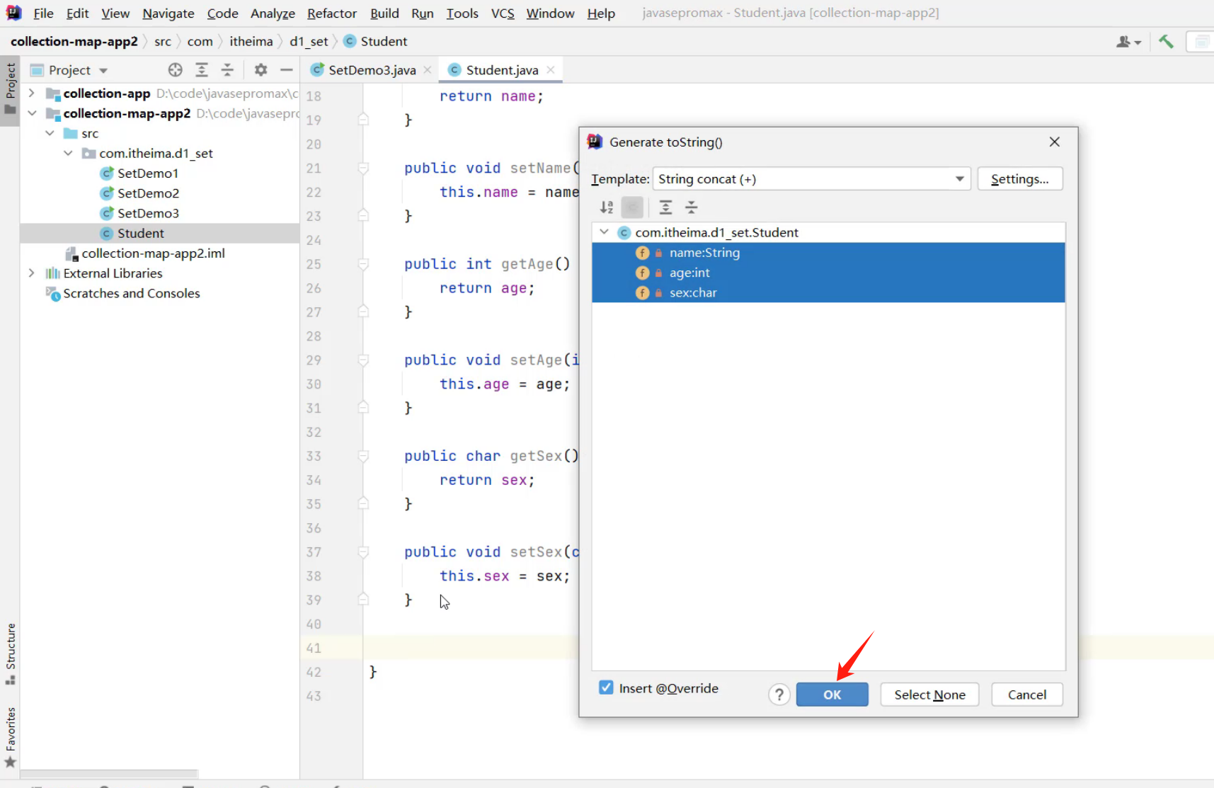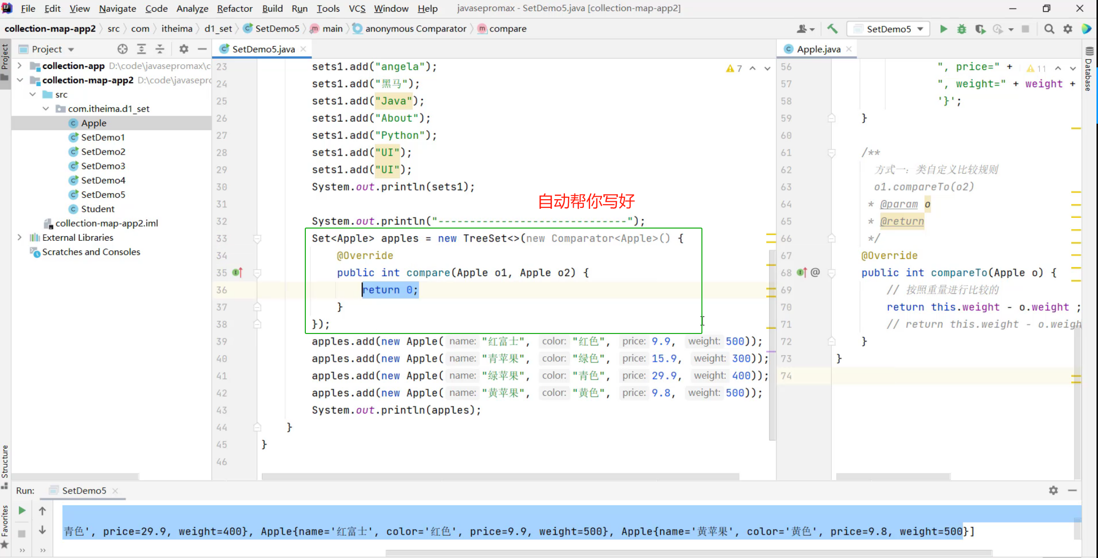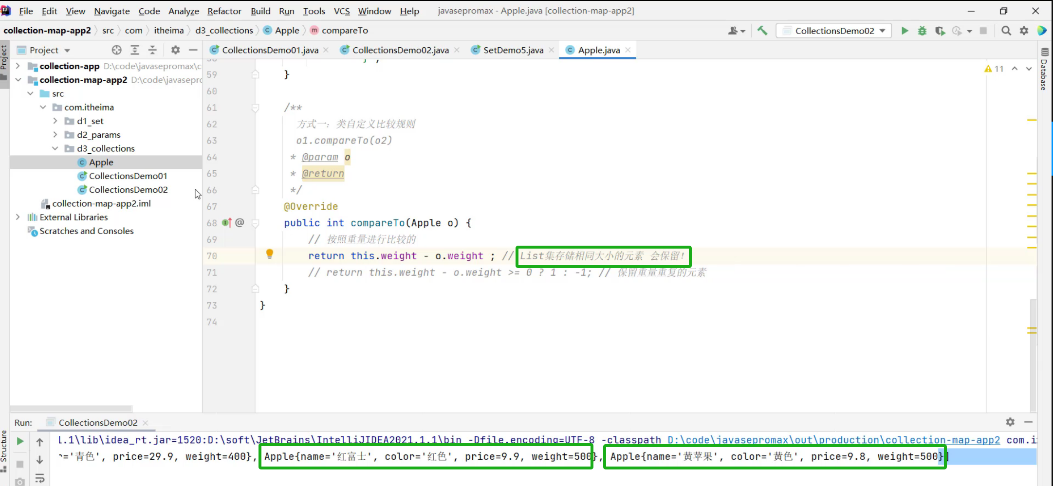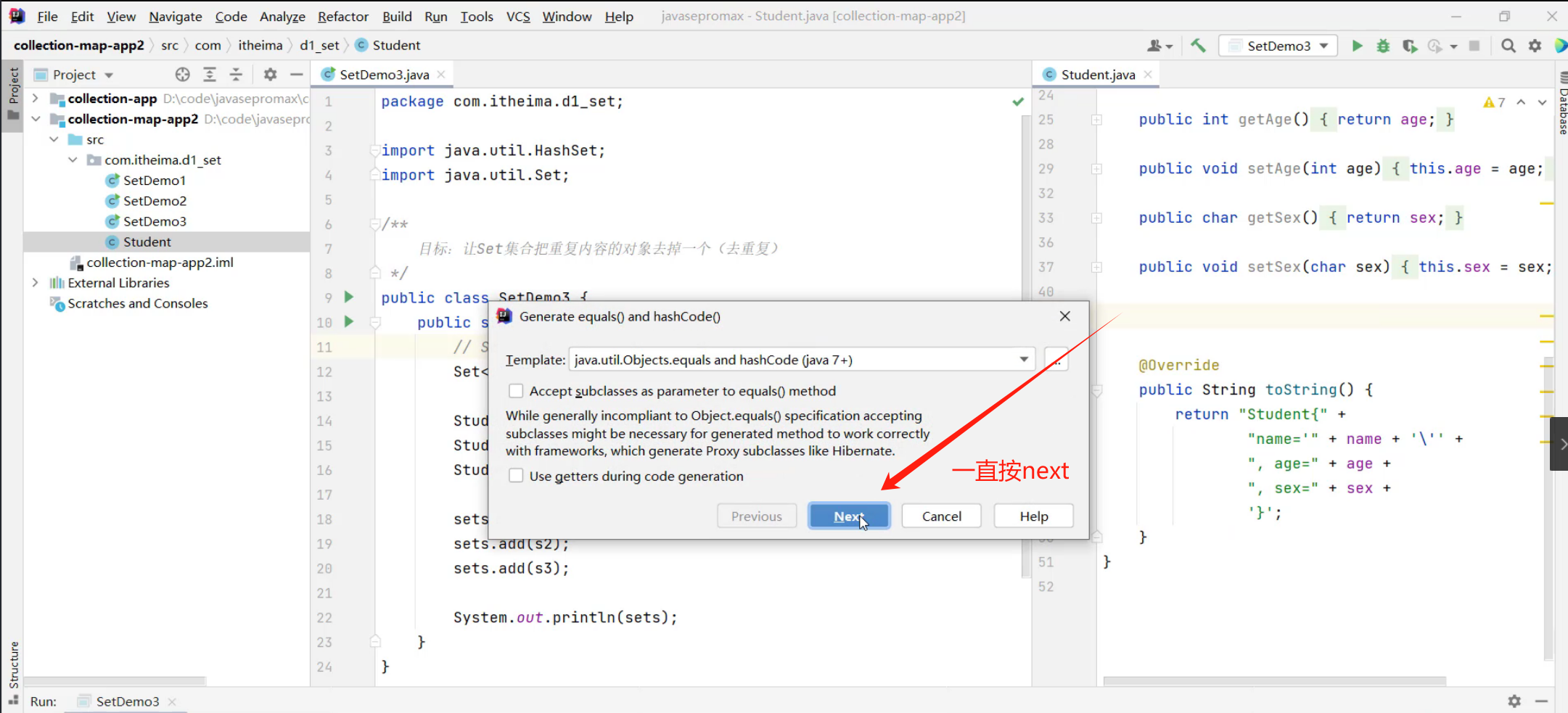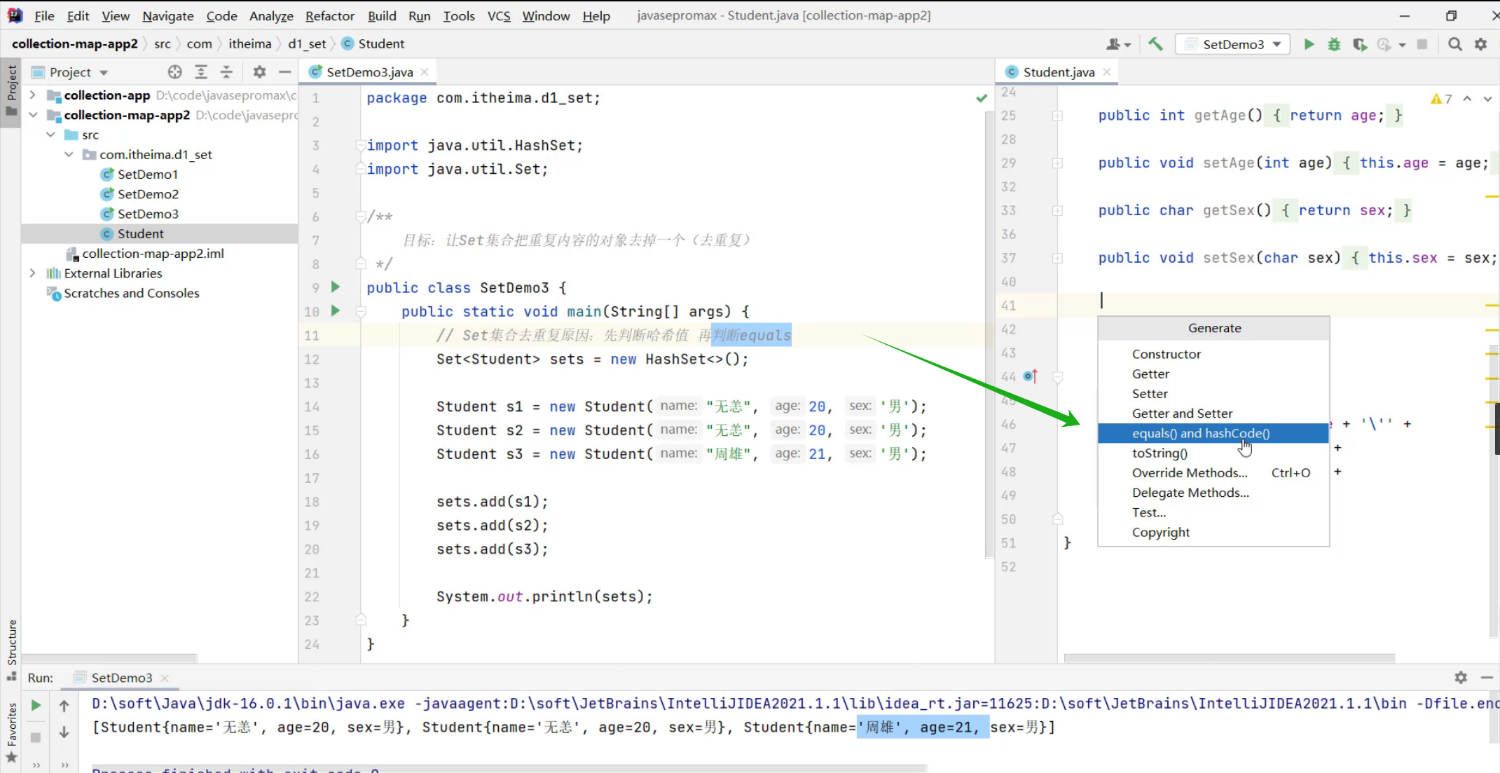 重写equals()和HashCode()方法之后,集合中重复元素被去除了: