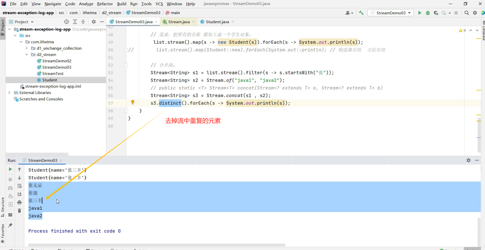 distinct:去除流中重复的元素