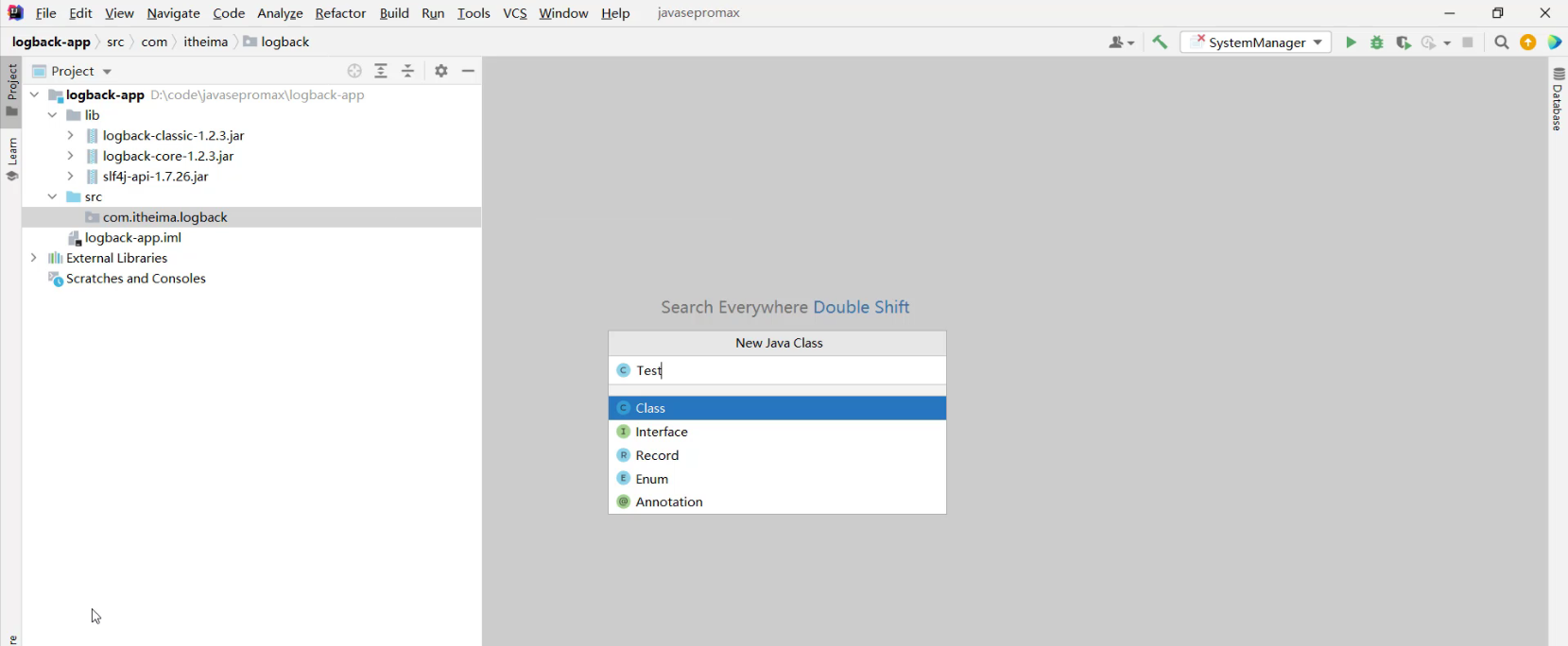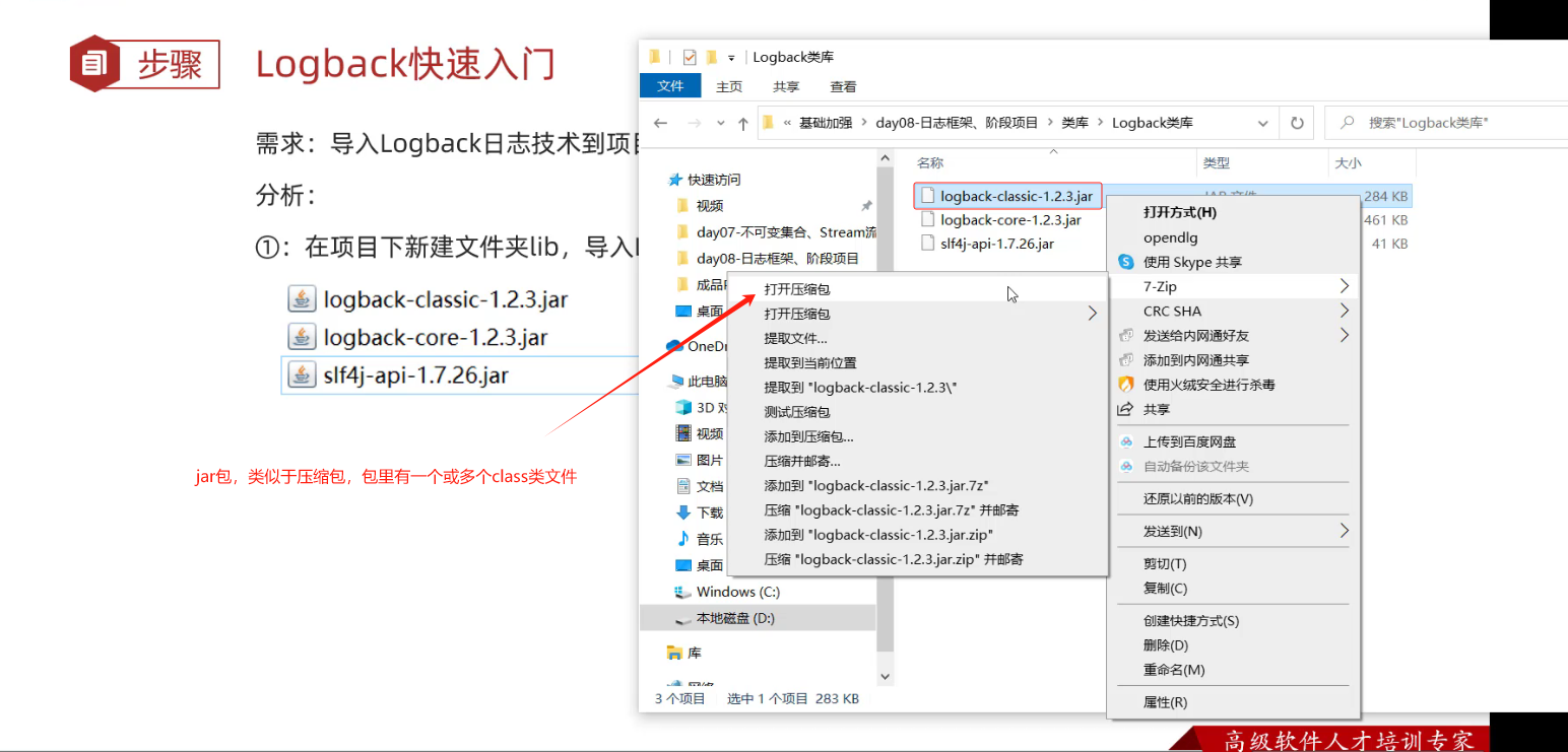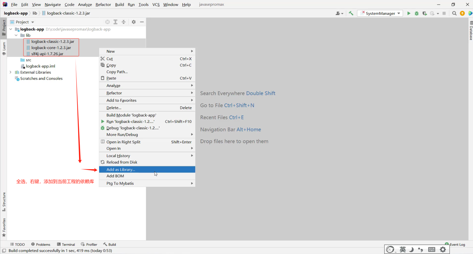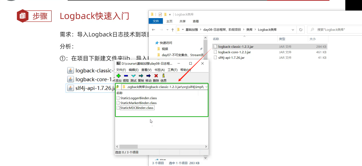 1.4.1 在项目下新建lib文件夹,导入Logback的相关jar包,并全选右键添加到项目依赖库中