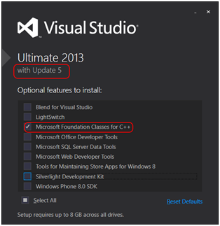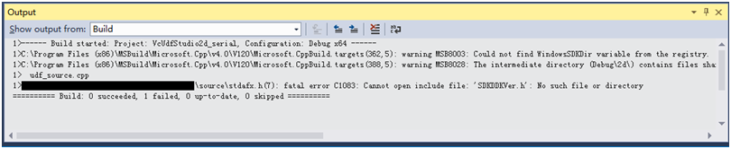 2. 安装Visual Studio 2013(或更高)专业版或旗舰版(Express版不支持),勾选“Microsoft Foundation Classes for C++”选项,其它选项视个人喜好。注意,Visual Studio 2013 请使用带update5的版本,对于其它更早期的2013版本,可能出现无法找到“afxv_cpu.h”文件,甚至插件菜单混乱的情况。安装前保证网络畅通。否则,可能会报告“WindowSDKDir”变量找不到的错误(如下图所示)。