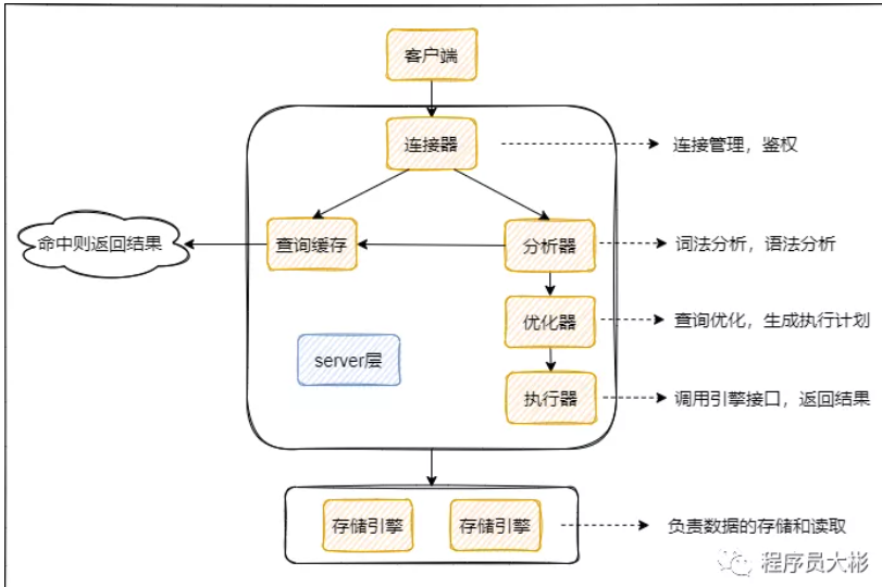 id > 1还是name = '大彬',优化器根据自己的优化算法选择执行效率最好的方案; - 校验权限,有权限就调用数据库引擎接口,返回引擎的执行结果。