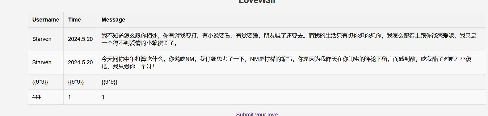 在Submit your love处先测试SSTI发现正常回显,看到第二个功能点