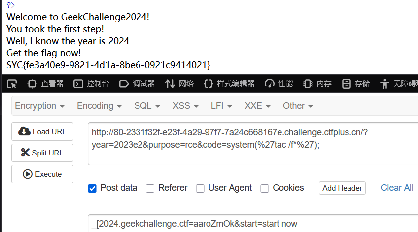 所有需要传参`_[2024.geekchallenge.ctf=aaroZmOk,考察的弱比较,md5("Geekchallenge2024_bmKtL")` 的结果为 `0e26778378603730793823426720797`, `sha1("aaroZmOk") = "0e66507019969427134894567494305185566735"`)