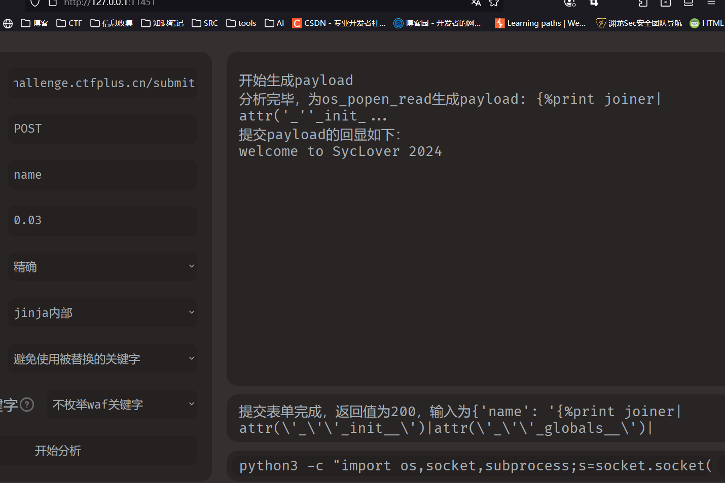 过滤了双花括号,应该可以用{%if 2>1%}success{%endif%}方法出来,不过我没尝试,用fenjing梭了这里cat /flag的话回显不了,所以这边用了反弹shell