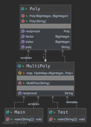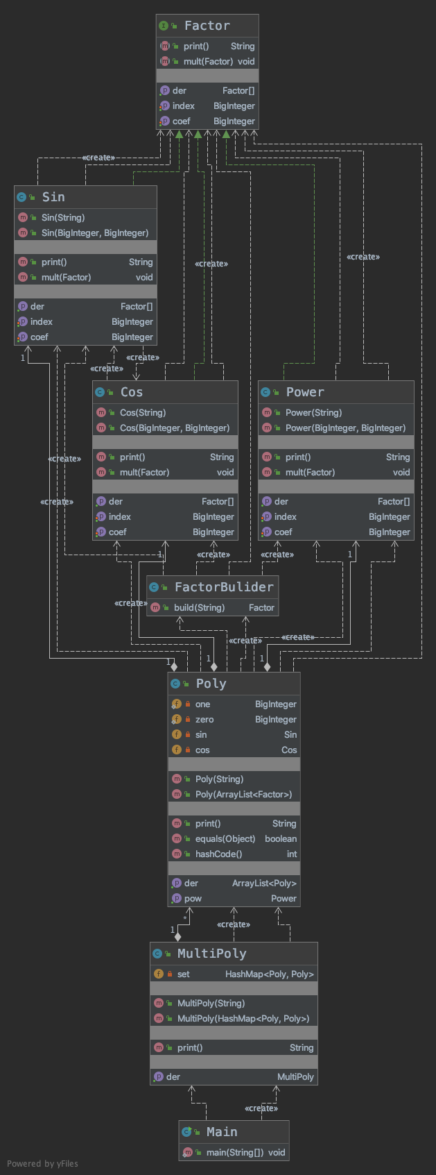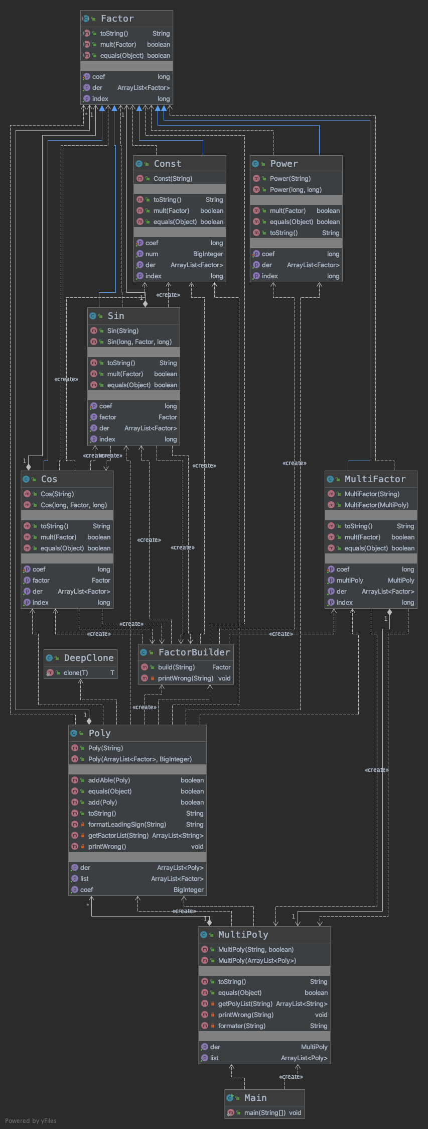 考虑到因子种类增多,本次选择了用统一的接口管理所有的因子,并构造了工厂类用于创建因子类。Poly与MultiPoly类仍然存在,前者用ArrayList存放了因子,后者则用HashMap存放了Poly。Poly重写了equils和getHashCode两个函数用于存入HashMap。但自己做法强暴而危险,会在后续分析中指出。 - 分析