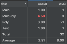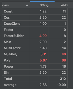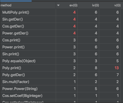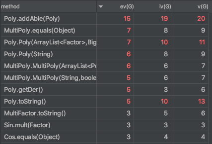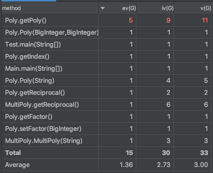 由于作业本身就并不复杂,整体代码的复杂度也并不高。上述图片中,Poly类的getPoly方法被认为复杂度最高,但其原因是在进行输出时,为了性能,作出了一系列判断;而MultiPoly类被认为整体复杂度高,是因为它承担着分割输入字符与优化输出但双重任务。