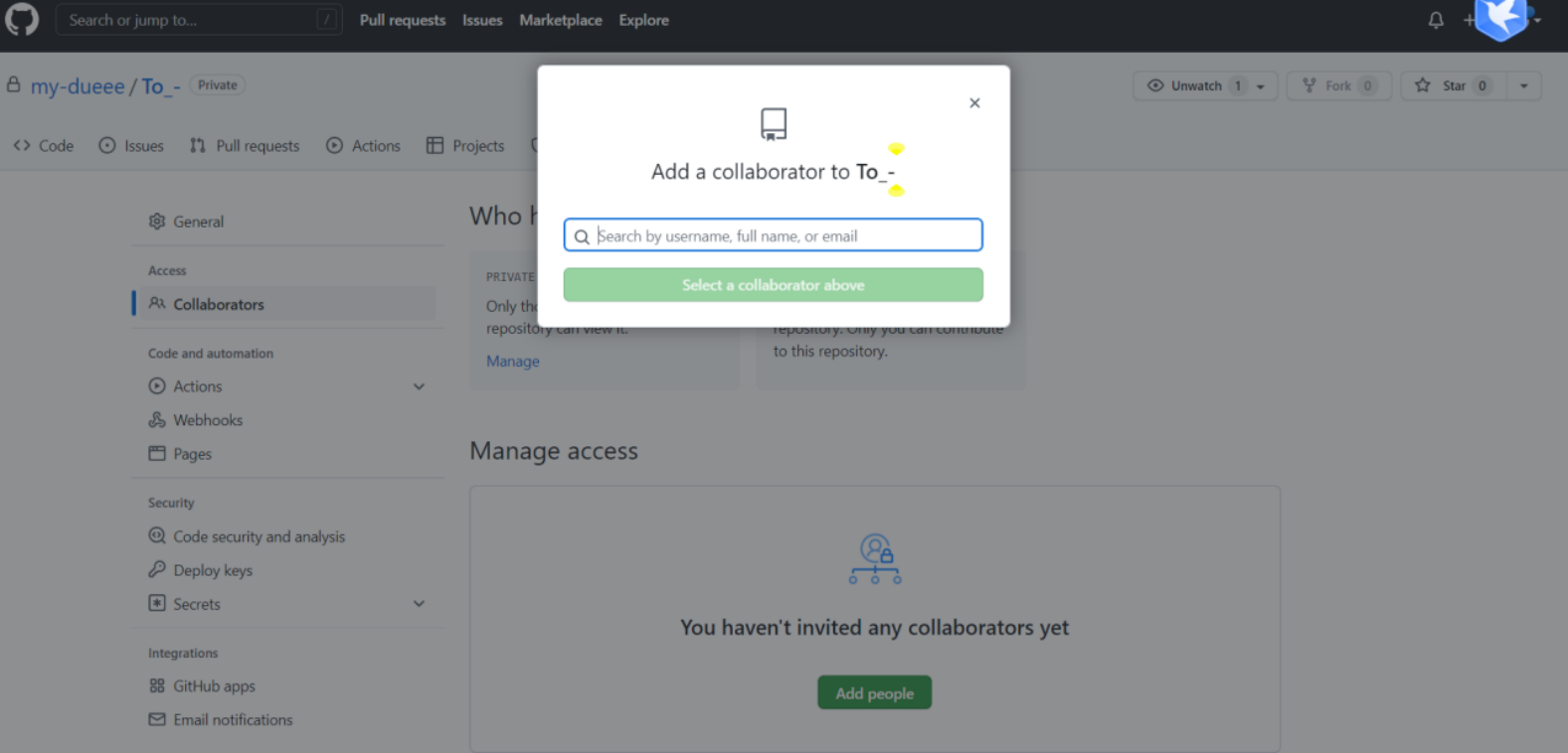 (2)代码仓库建立完成,我们可以在Github上邀请好友管理,同时创建者可以对管理者设置权限,只有主要负责人才能管理融合部分,而普通管理者没有此权限。