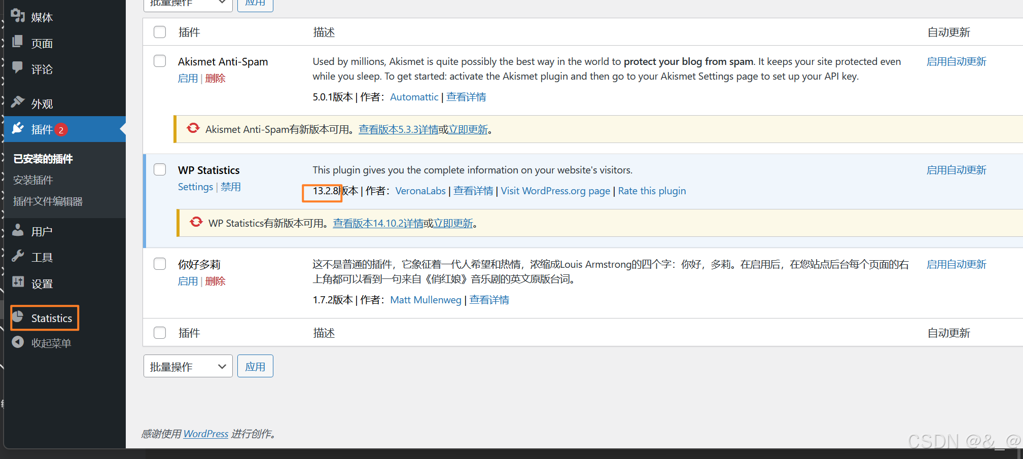 可以看到wordpress安装了wp statistics(wp 统计)插件,并且版本在13.2.9以内,在cve-2022-4230的影响范围内。漏洞利用的条件、payload和演示如下: