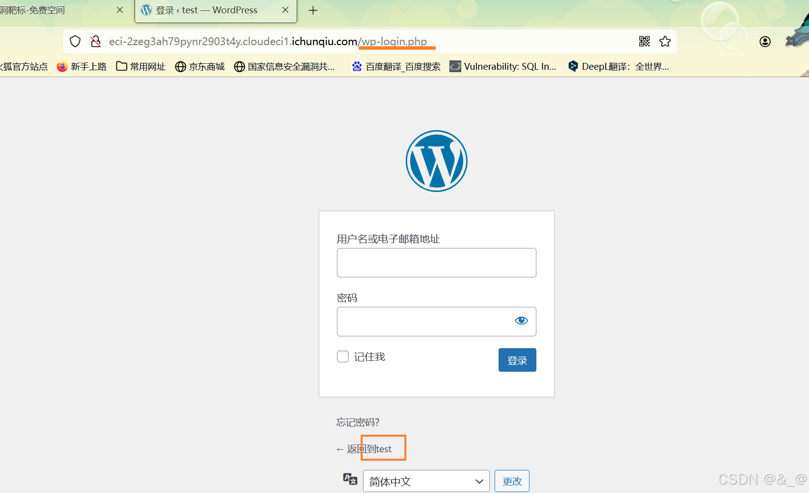 跳转至后台登录页面,且观察网页可以知道其中有一个用户的用户名为test,接下来也有几种处理方式: