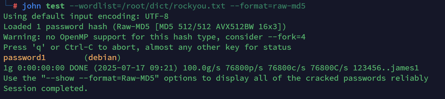 john test --wordlist=/root/dict/rockyou.txt --format=raw-md5