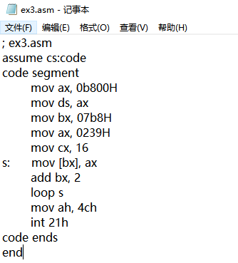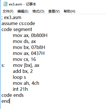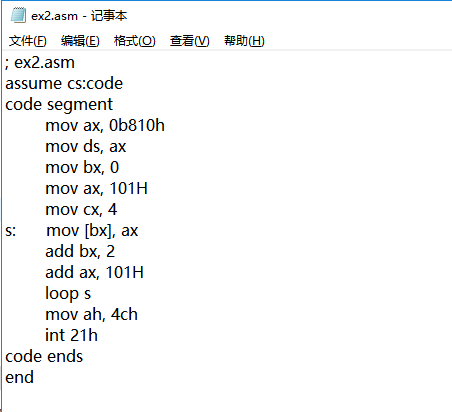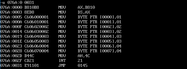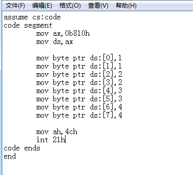assume cs:code code segment mov ax,0b810h mov ds,ax mov byte ptr ds:[0],1 mov byte ptr ds:[1],1 mov byte ptr ds:[2],2 mov byte ptr ds:[3],2 mov byte ptr ds:[4],3 mov byte ptr ds:[5],3 mov byte ptr ds:[6],4 mov byte ptr ds:[7],4 mov ah,4ch int 21h code ends end