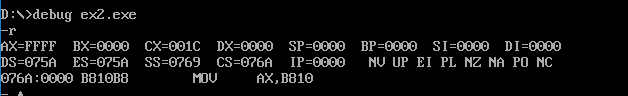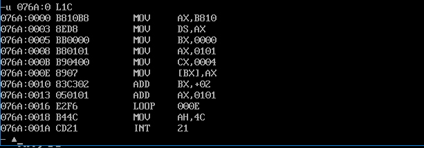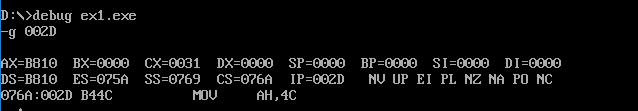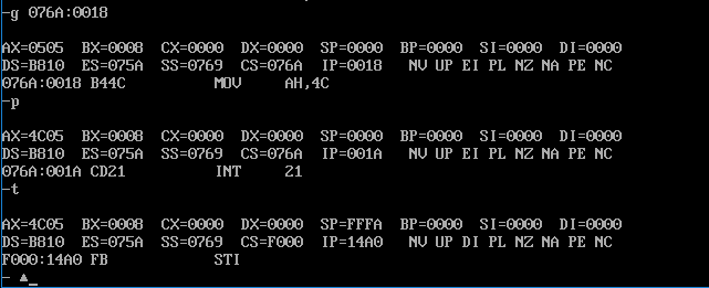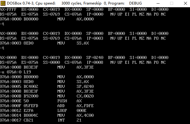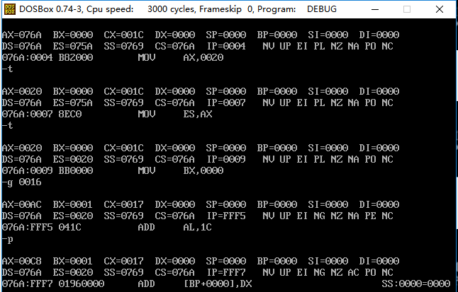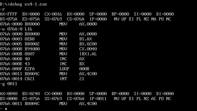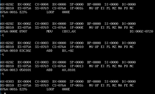 在单步执行到loop命令后,IP重新变成了000E H,再次进入循环,下面可以使用g命令跳过循环步骤,并继续单步调试,执行完剩下两个指令,截图如下: