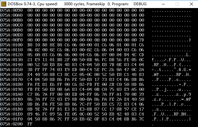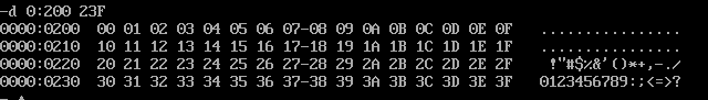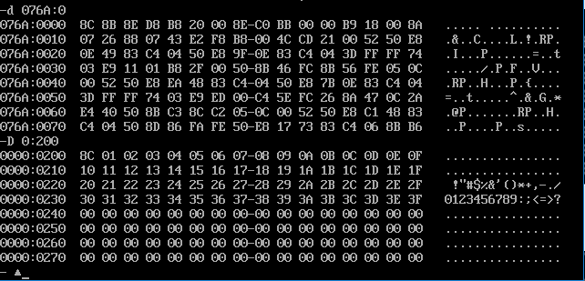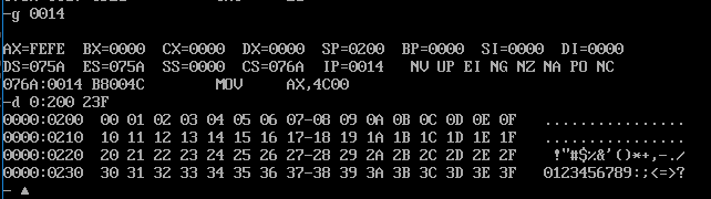 2)源代码汇编、链接无误后,灵活使用debug的t命令、g命令、p命令调试,用d命令查看0:200~0:23F,确认是否将0~63传送至此段内存区域。