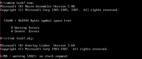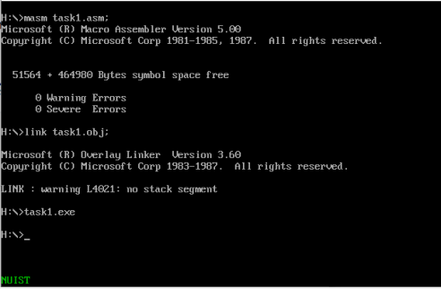 2)使用masm、link对task1.asm进行汇编、链接,得到可执行文件task1.exe,运行并观察结果。