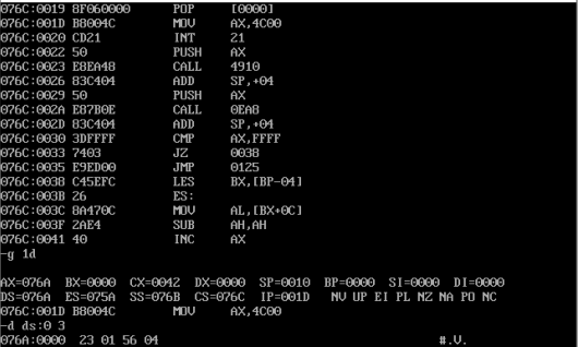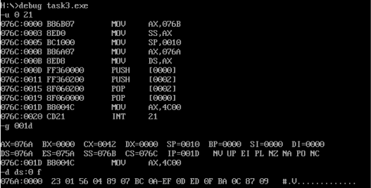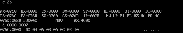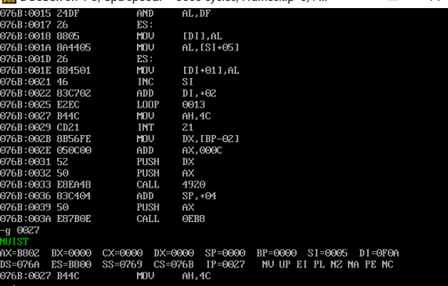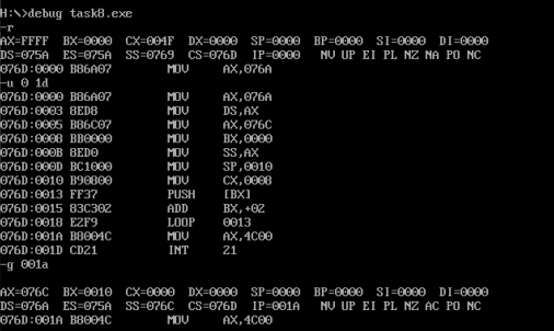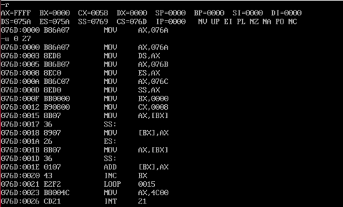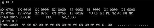 由上图可知:CPU执行程序,程序返回前,cs=076CH,ss=076BH,ds= 076AH。