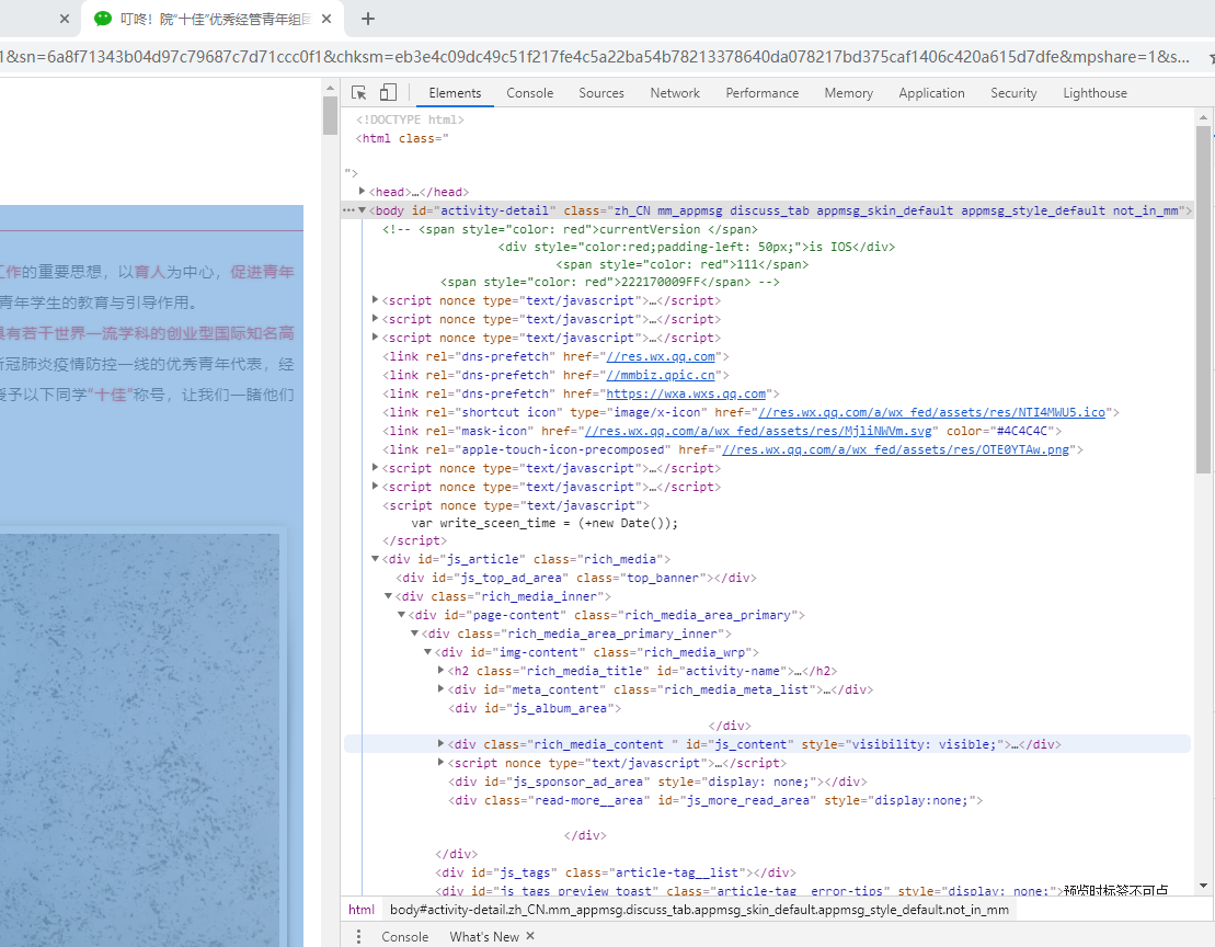 首先先对《叮咚!院“十佳”优秀经管青年组团出道,快来打call~》这篇微信文章分析,查看网页源代码可以发现,整篇文章的文字部分以层次关系分别在<div id = “js_article”> --> <div class = “rich_media_inner”> --> <div id = “page_content> --> <div class = “rich_media_area_primary> --><div id = “img-content”> --> <div class = “rich_media_content”> 的标签之下,利用BeautifulSoup的find_all方法就可以找到class为rich_media_content的div之下的内容。网页的源代码层级如下