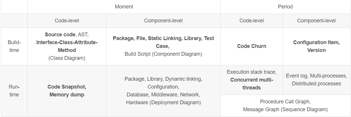 Build-time, moment, and code-level view 关注的是源码的组织情况,可在词汇(源码)、语法(抽象语法树)、语义(类图)三个层面分别分析。