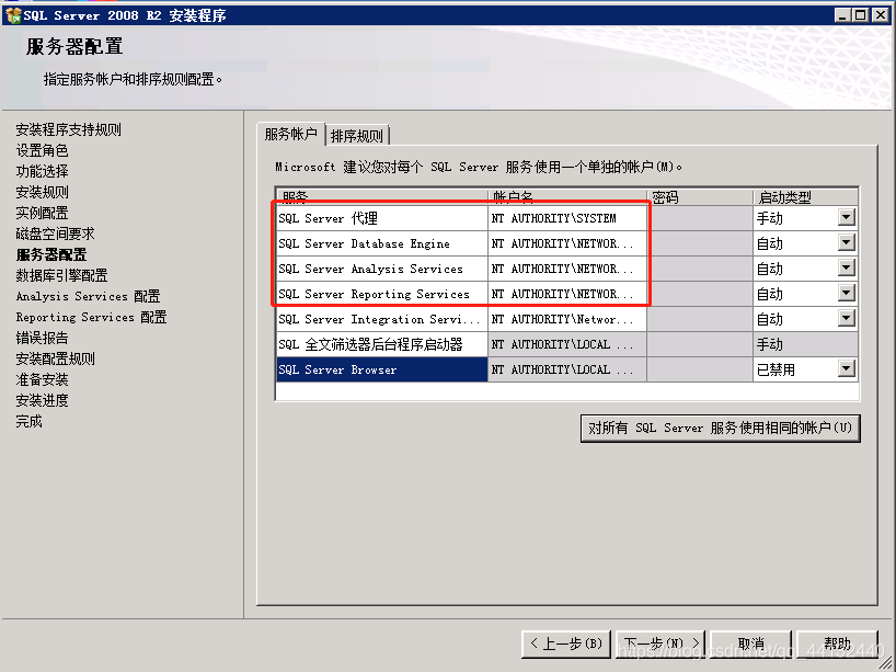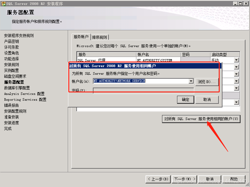 选择”对所有SQL Server 服务使用相同的账号“,浏览选择”NETWORK SERVICE“,确定,下一步