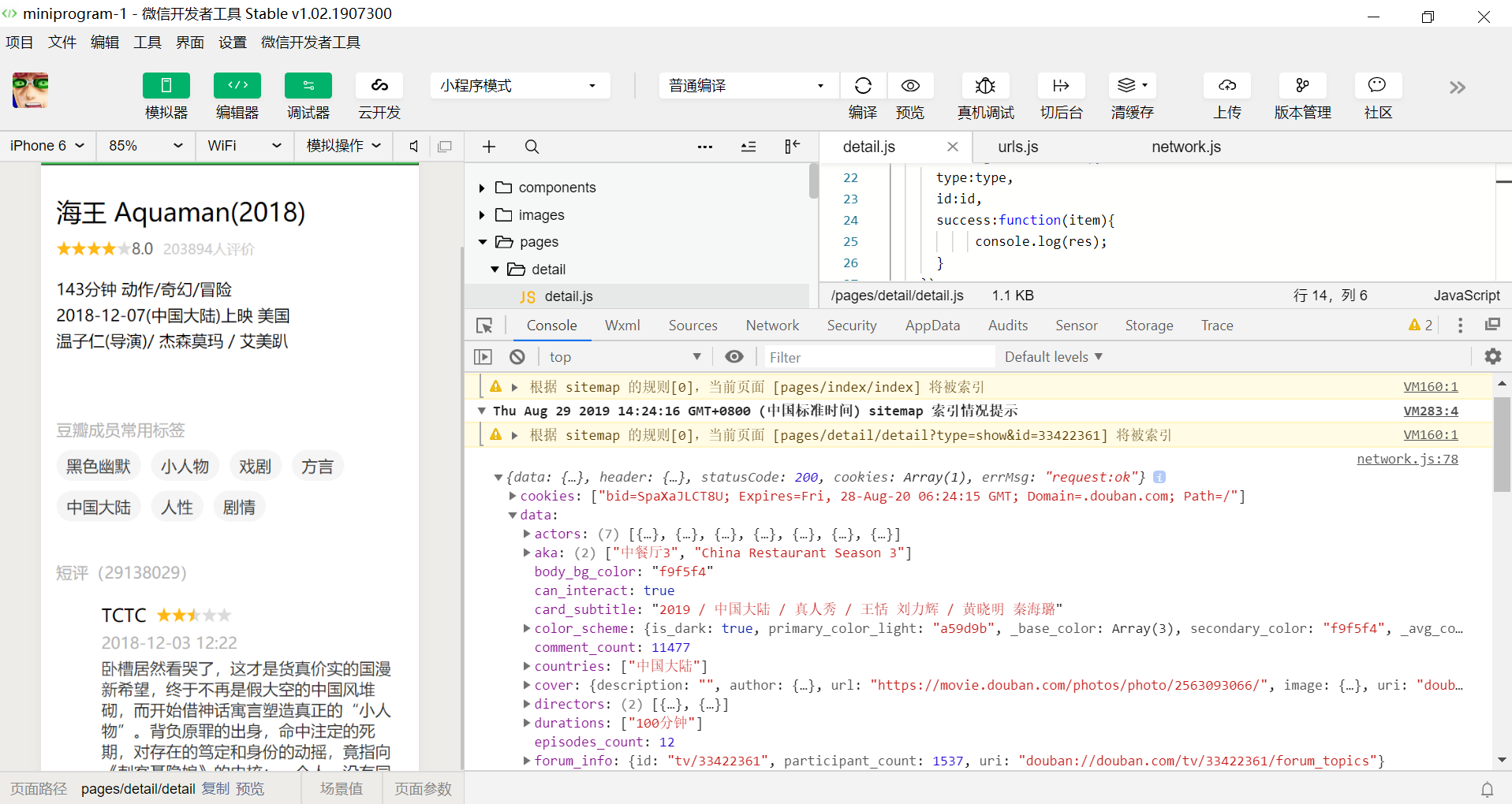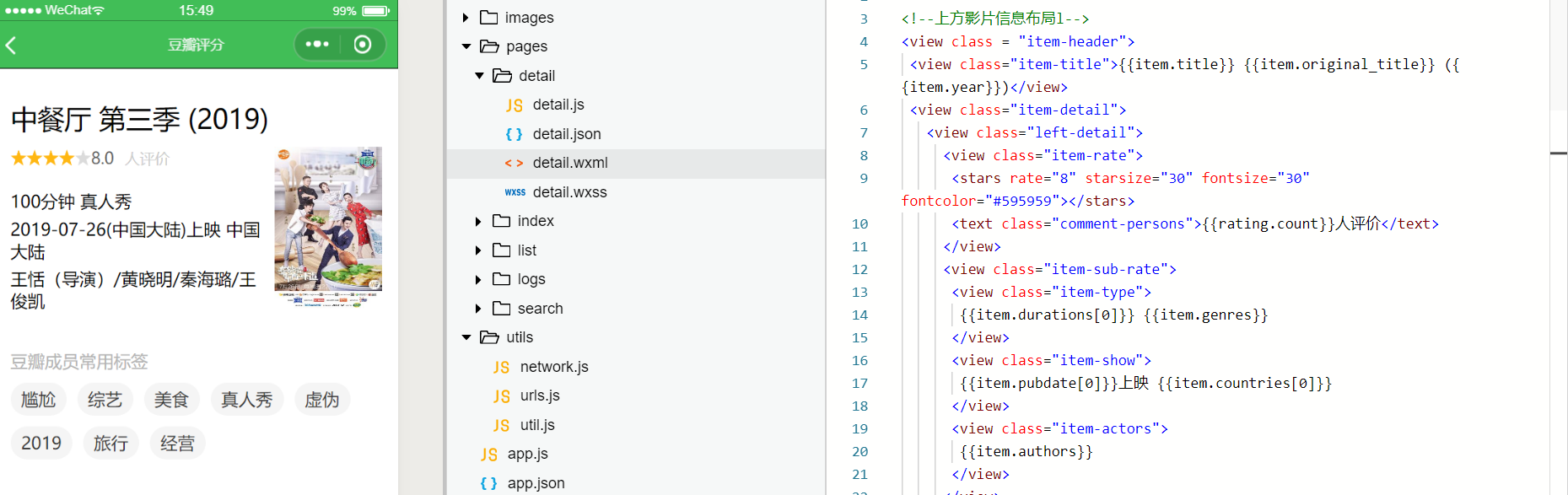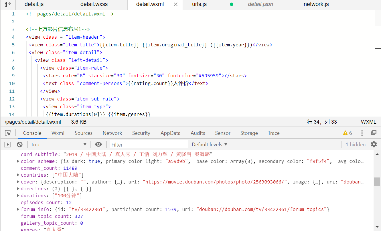 ②下午则将这些影视信息的数据布署进detail.wxml页面中(遇到了许许多多大大小小的问题,放在后面的个人小结上面讲)