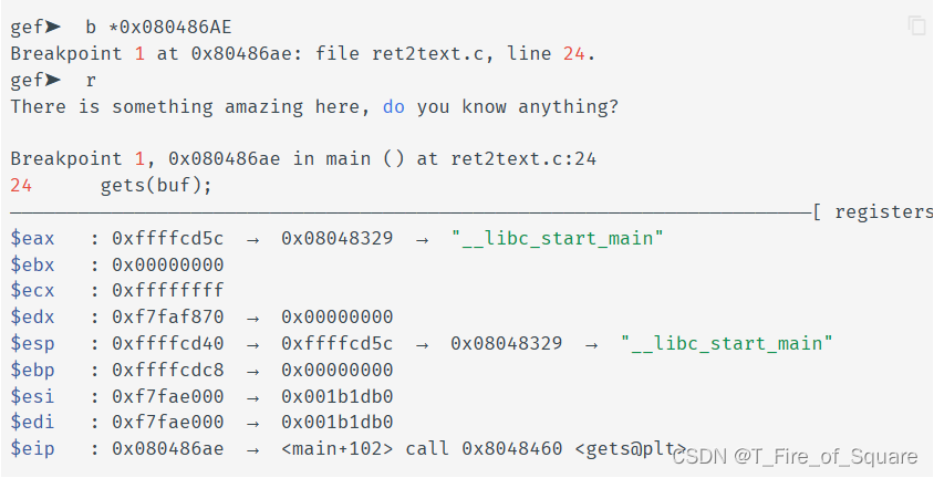 可以看到 esp 为 0xffffcd40,ebp 为具体的 payload 如下 0xffffcdc8,同时 s 相对于 esp 的索引为 [esp+0x1c],所以,s 的地址为 0xffffcd5c,所以 s 相对于 ebp 的偏移为 0x6C,所以相对于返回地址的偏移为 0x6c+4。