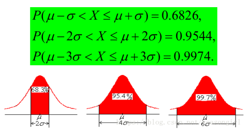 3、三个重要的区间面积值:0.6826、0.9544、0.9974(3σ原则,区间外的概率小于5%!);