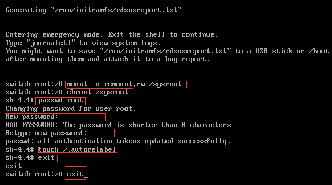 1、重启虚拟机 2、在linux16末尾加上 rd.break,ctrl+x执行 3、mount -o remount,rw /sysroot 4、chroot /sysroot 5、passwd root 6、输入新密码: 7、确认密码 8、touch /.autorelabel 9、exit 10、exit