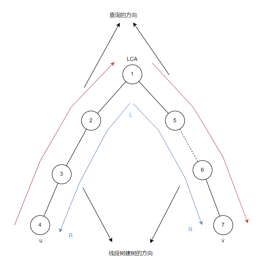 但我们实际想要查询的方向是红色箭头所指的方向,我们发现,在从 \(u\to \text{LCA}(u,v)\) 的路径上,线段树的方向与我们想要查询的方向南辕北辙,为了解决这个问题,我们在链上的合并时,先从起点和终点分别按照线段树方向维护两个链上的信息,在最后一步时将起点所在链的信息翻转,再与终点链的信息合并,从而得到完整的信息。