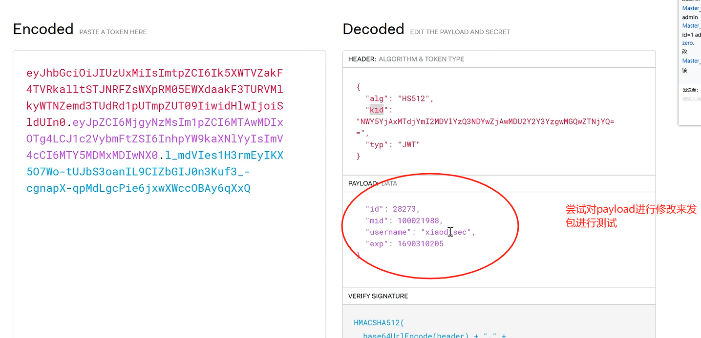 2)敏感信息泄露:通过JWt.io解密出Payload后查看其中是否包含敏感信息,如弱加密的密码等
