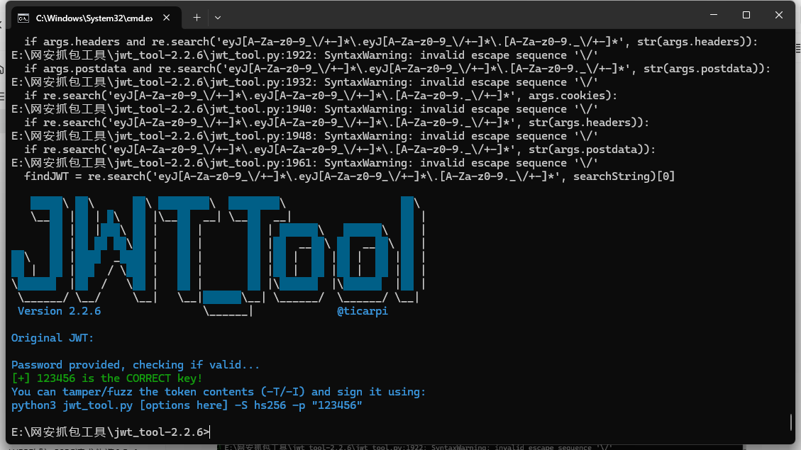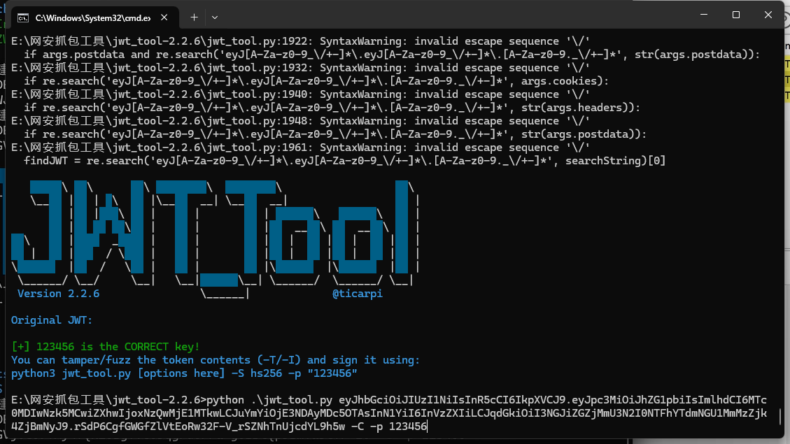 某些签名算法,例如HS256(HMAC+SHA-256),会像密码一样使用一个任意的、独立的字符串作为秘密密钥。这个秘钥如被轻易猜到或暴力破解,则攻击者能以任意的头部和载荷值来创建JWT,然后用密钥重新给令牌签名。