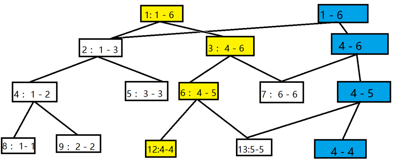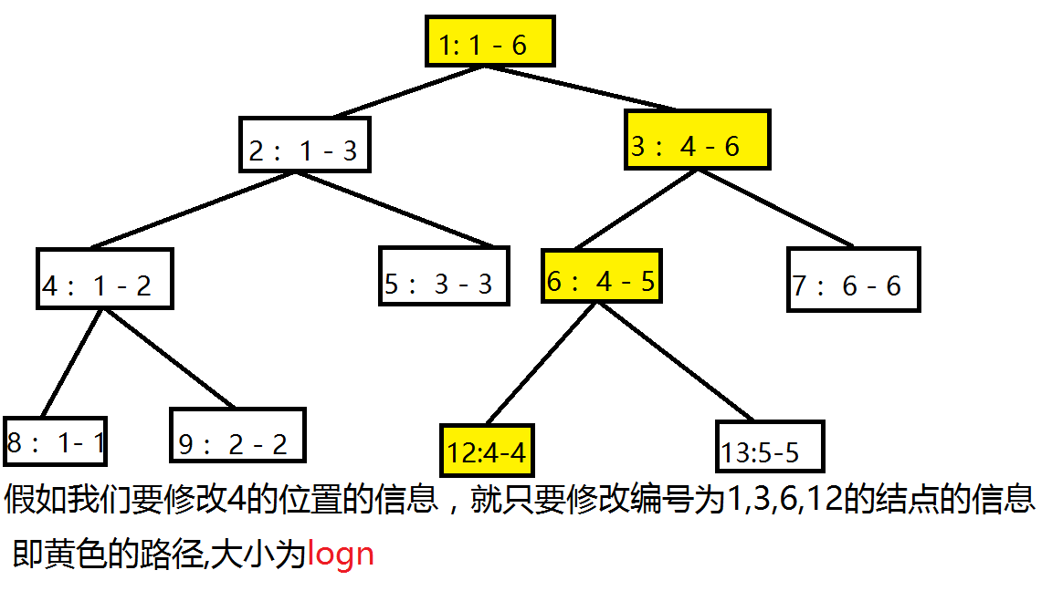 众所周知,在叶子结点为 \(n\) 的二叉树中,总结点数约为 \(2n\), 深度最大为 \(logn\), 所以修改为 \(O(logn)\), 查询也为 \(O(logn)\), 因为当我们跑到的节点所维护的区间在查询区间中时,可以直接将该节点的信息返回。