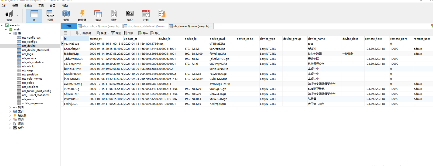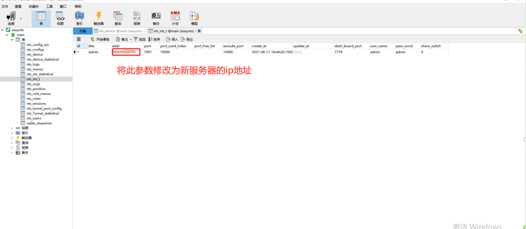 4.将nts_nts_t的表内的ip地址修改为新服务器的ip地址如下: