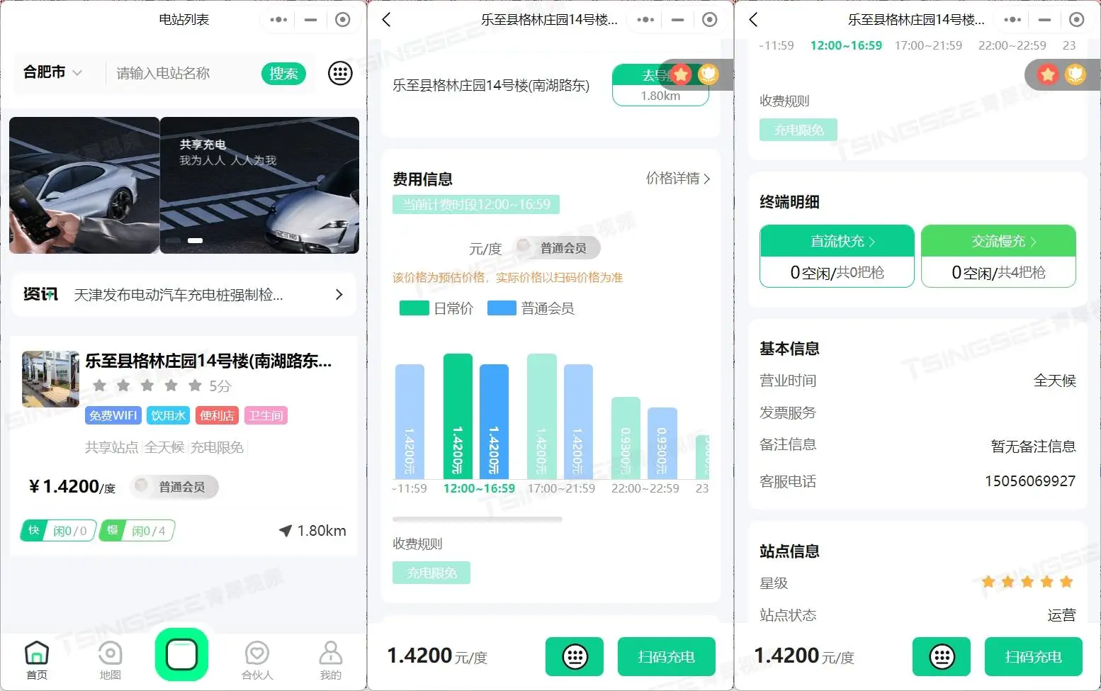 - 站点查询:搜索查询附近充电站,查看充电站详细信息,一键导航到目标充电站。