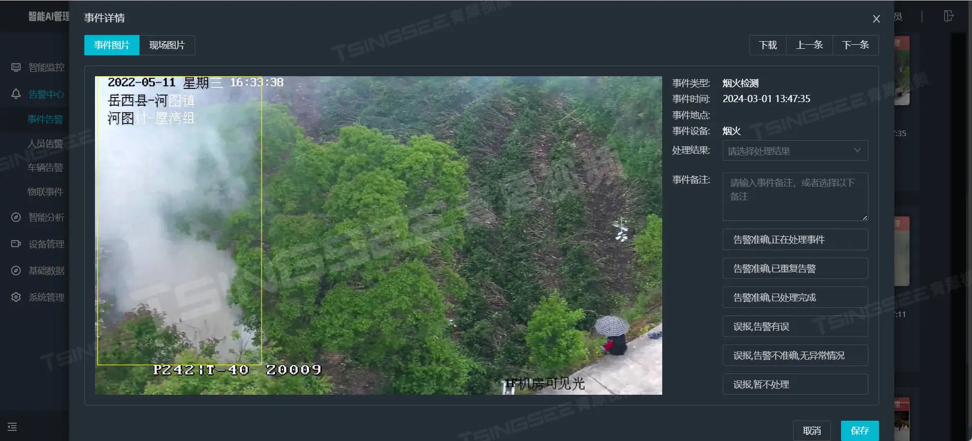 通过硬件内置的烟火识别算法或接入烟火检测摄像机,可对现场进行实时视频监控与烟火识别分析,当检测到疑似烟雾、火焰、火点的场景时,将通过主动预警推送的方式,进行抓拍与告警,告警还能通过弹窗、提示音等方式提醒管理人员及时查看和处理。此外,智能分析网关V4还支持物联网传感器接入,通过接入烟感、温湿度等传感器,收集实时监测的温湿度数据和烟雾感应状态,极大提高对现场消防隐患的多维感知能力。