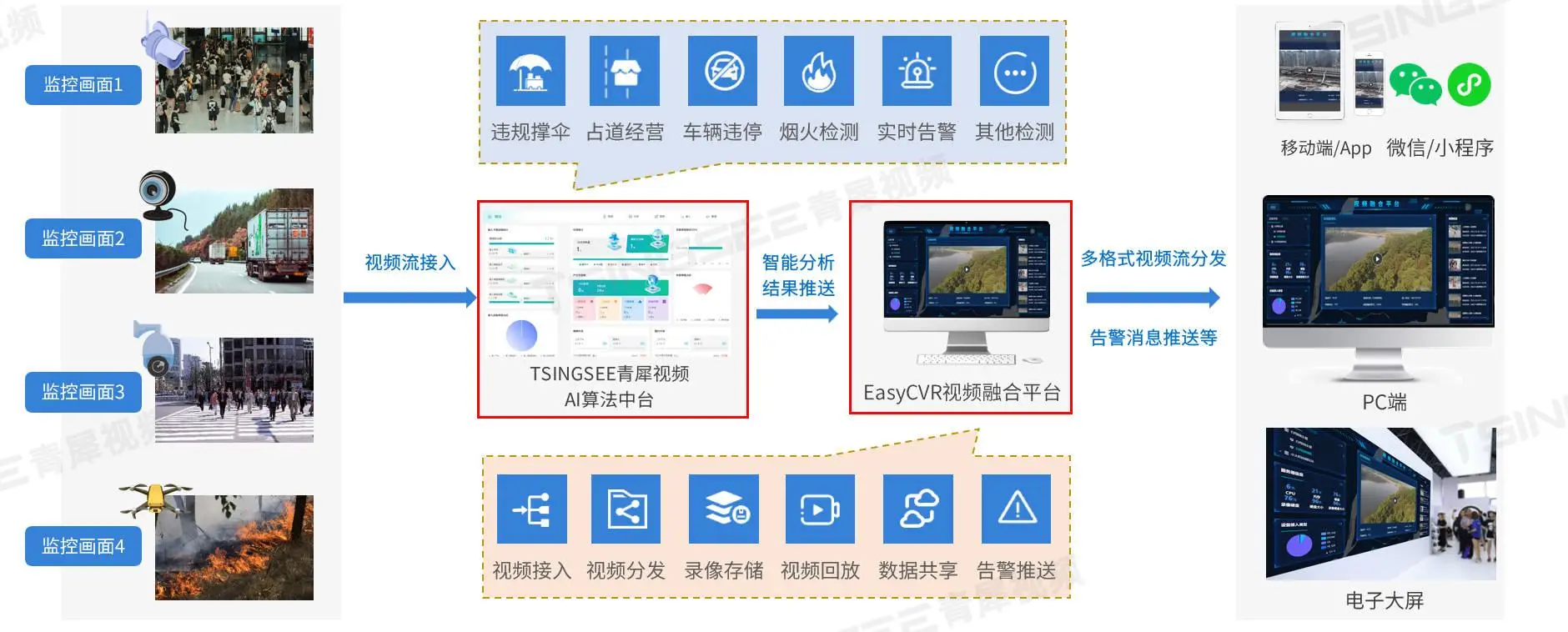 安防视频监控EasyCVR视频智能汇聚平台可以将不同类型、不同协议的前端设备,通过不同网络环境进行接入、传输、视频汇聚和管理,在平台后端接入AI算法中台,借助算法中台部署的丰富算法模型对监管场景进行智能检测,对沿街商铺的违规撑伞、出店经营、车辆占道违停、违规广告牌等情况进行识别,并实时抓拍和告警。系统将抓拍现场截图并上报给城管中心业务平台,方便管理人员查看与处理,固定违法事实。